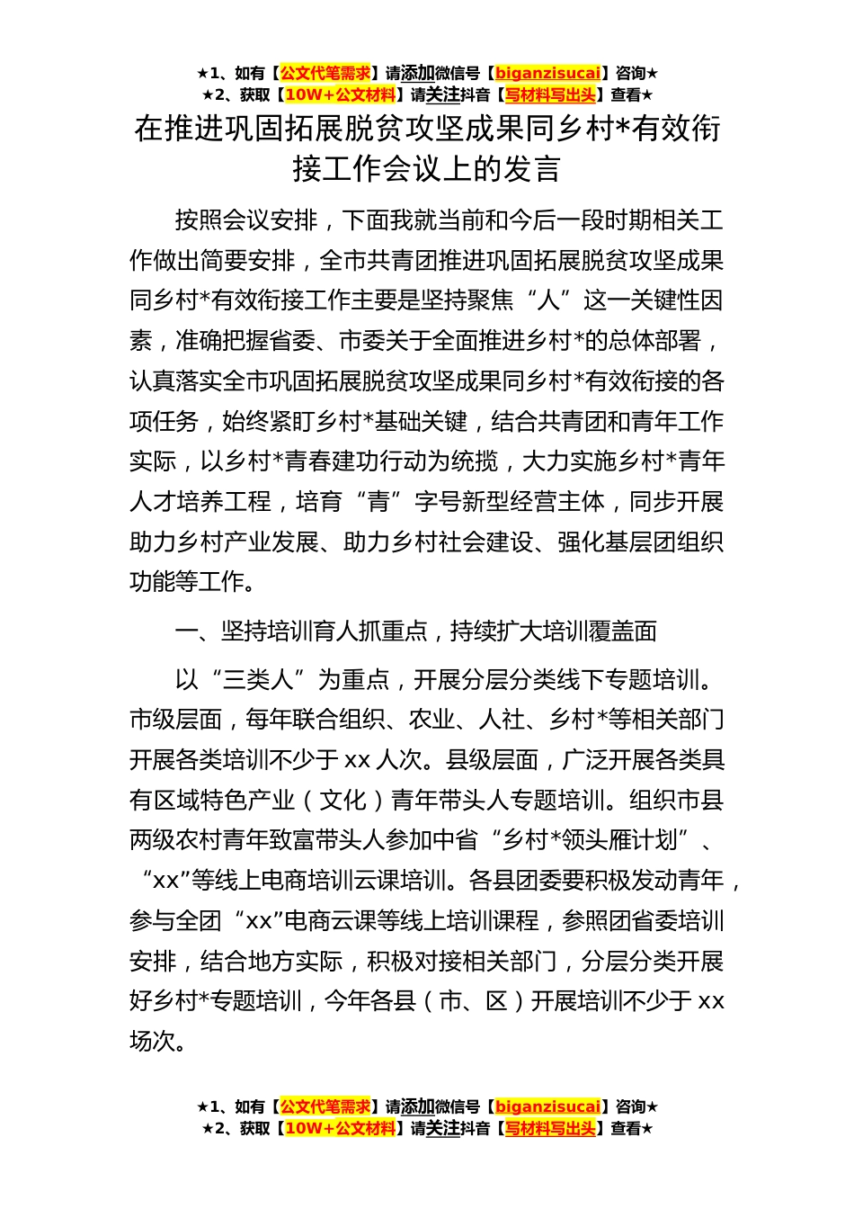 ★1、如有【公文代笔需求】请添加微信号【biganzisucai】咨询★★2、获取【10W+公文材料】请关注抖音【写材料写出头】查看★★1、如有【公文代笔需求】请添加微信号【biganzisucai】咨询★★2、获取【10W+公文材料】请关注抖音【写材料写出头】查看★★1、如有【公文代笔需求】请添加微信号【biganzisucai】咨询★★2、获取【10W+公文材料】请关注抖音【写材料写出头】查看★在推进巩固拓展脱贫攻坚成果同乡村*有效衔接工作会议上的发言按照会议安排,下面我就当前和今后一段时期相关工作做出简要安排,全市共青团推进巩固拓展脱贫攻坚成果同乡村*有效衔接工作主要是坚持聚焦“人”这一关键性因素,准确把握省委、市委关于全面推进乡村*的总体部署,认真落实全市巩固拓展脱贫攻坚成果同乡村*有效衔接的各项任务,...