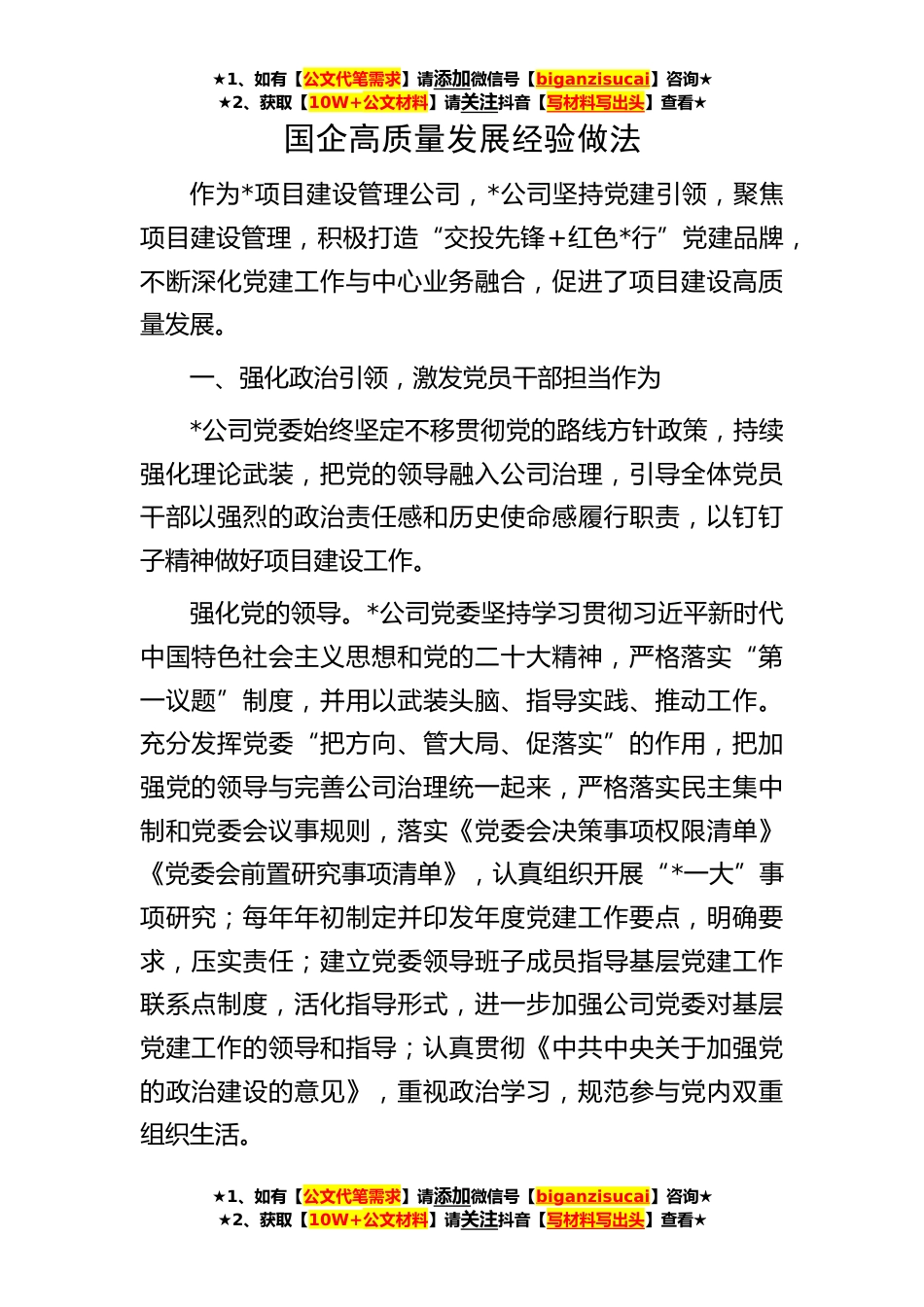★1、如有【公文代笔需求】请添加微信号【biganzisucai】咨询★★2、获取【10W+公文材料】请关注抖音【写材料写出头】查看★★1、如有【公文代笔需求】请添加微信号【biganzisucai】咨询★★2、获取【10W+公文材料】请关注抖音【写材料写出头】查看★★1、如有【公文代笔需求】请添加微信号【biganzisucai】咨询★★2、获取【10W+公文材料】请关注抖音【写材料写出头】查看★国企高质量发展经验做法作为*项目建设管理公司,*公司坚持党建引领,聚焦项目建设管理,积极打造“交投先锋+红色*行”党建品牌,不断深化党建工作与中心业务融合,促进了项目建设高质量发展。一、强化政治引领,激发党员干部担当作为*公司党委始终坚定不移贯彻党的路线方针政策,持续强化理论武装,把党的领导融入公司治理,引导全体党员干...