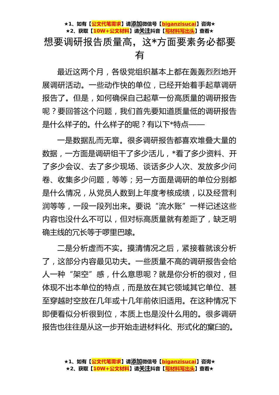 ★1、如有【公文代笔需求】请添加微信号【biganzisucai】咨询★★2、获取【10W+公文材料】请关注抖音【写材料写出头】查看★★1、如有【公文代笔需求】请添加微信号【biganzisucai】咨询★★2、获取【10W+公文材料】请关注抖音【写材料写出头】查看★★1、如有【公文代笔需求】请添加微信号【biganzisucai】咨询★★2、获取【10W+公文材料】请关注抖音【写材料写出头】查看★想要调研报告质量高,这*方面要素务必都要有最近这两个月,各级党组织基本上都在轰轰烈烈地开展调研活动。一些动作快的单位,已经开始着手起草调研报告了。但是,如何确保自己起草一份高质量的调研报告呢?要回答这个问题,我们首先要知道质量低的调研报告是什么样子的。什么样子的呢?有以下*特点——一是数据乱而无章。很多调研报告都喜...