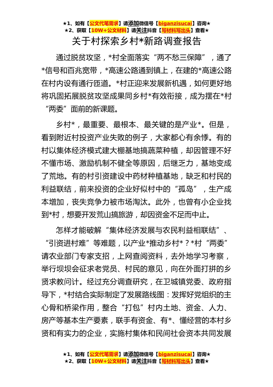 ★1、如有【公文代笔需求】请添加微信号【biganzisucai】咨询★★2、获取【10W+公文材料】请关注抖音【写材料写出头】查看★★1、如有【公文代笔需求】请添加微信号【biganzisucai】咨询★★2、获取【10W+公文材料】请关注抖音【写材料写出头】查看★★1、如有【公文代笔需求】请添加微信号【biganzisucai】咨询★★2、获取【10W+公文材料】请关注抖音【写材料写出头】查看★关于村探索乡村*新路调查报告通过脱贫攻坚,*村全面落实“两不愁三保障”,通了*信号和百兆宽带,*高速公路通到镇上,在建的*高速公路在村内设有通行匝道。*村正迎来发展新机遇,如何更好地将巩固拓展脱贫攻坚成果同乡村*有效衔接,成为摆在*村“两委”面前的新课题。乡村*,最重要、最根本、最关键的是产业*。但是,看到附近村投资产业失...