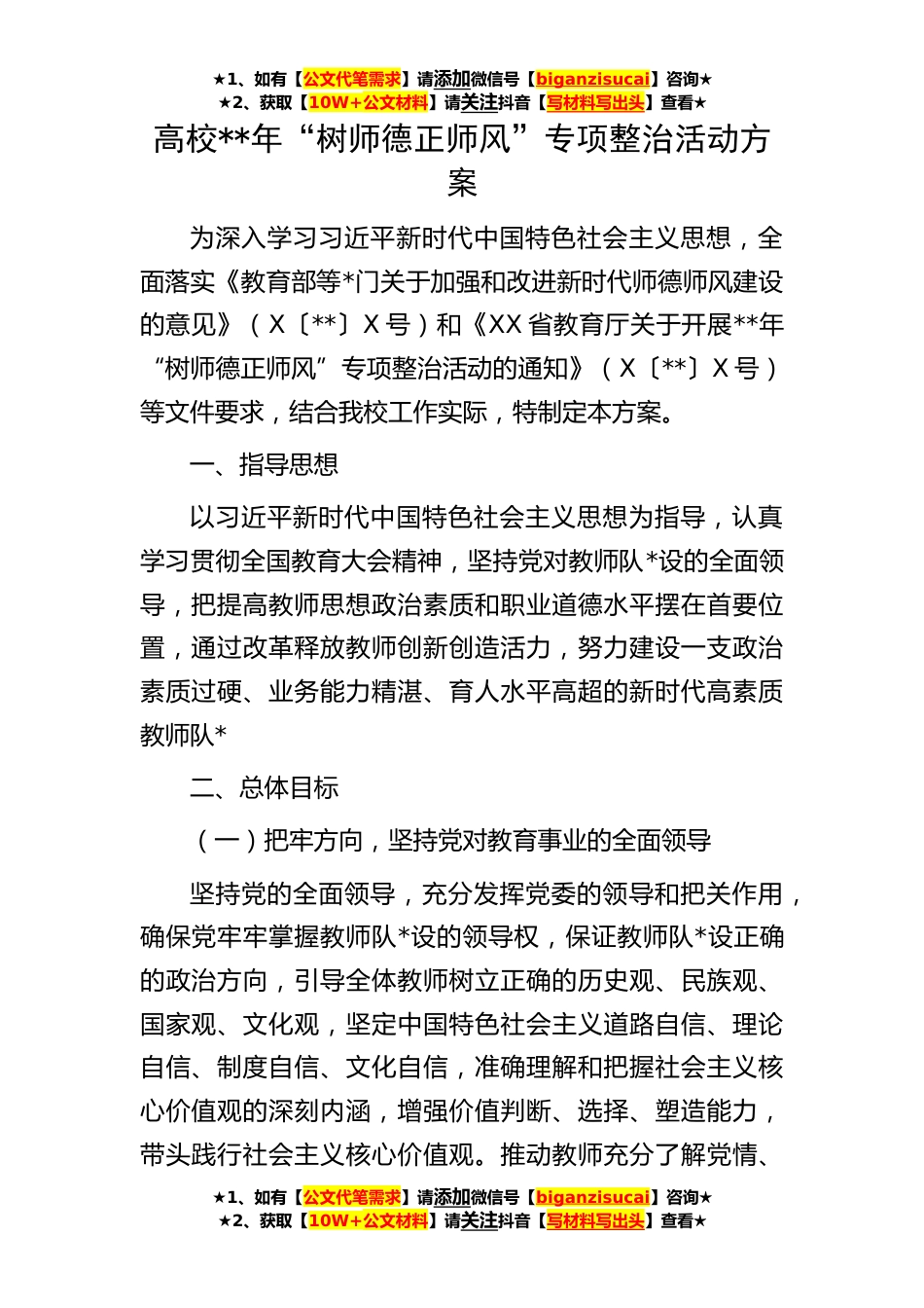 ★1、如有【公文代笔需求】请添加微信号【biganzisucai】咨询★★2、获取【10W+公文材料】请关注抖音【写材料写出头】查看★★1、如有【公文代笔需求】请添加微信号【biganzisucai】咨询★★2、获取【10W+公文材料】请关注抖音【写材料写出头】查看★★1、如有【公文代笔需求】请添加微信号【biganzisucai】咨询★★2、获取【10W+公文材料】请关注抖音【写材料写出头】查看★高校**年“树师德正师风”专项整治活动方案为深入学习习近平新时代中国特色社会主义思想,全面落实《教育部等*门关于加强和改进新时代师德师风建设的意见》(X〔**〕X号)和《XX省教育厅关于开展**年“树师德正师风”专项整治活动的通知》(X〔**〕X号)等文件要求,结合我校工作实际,特制定本方案。一、指导思想以习近平新时代中国特色社...