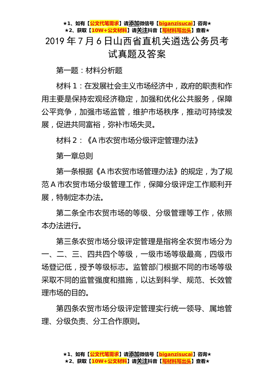 ★1、如有【公文代笔需求】请添加微信号【biganzisucai】咨询★★2、获取【10W+公文材料】请关注抖音【写材料写出头】查看★★1、如有【公文代笔需求】请添加微信号【biganzisucai】咨询★★2、获取【10W+公文材料】请关注抖音【写材料写出头】查看★★1、如有【公文代笔需求】请添加微信号【biganzisucai】咨询★★2、获取【10W+公文材料】请关注抖音【写材料写出头】查看★2019年7月6日山西省直机关遴选公务员考试真题及答案第一题:材料分析题材料1:在发展社会主义市场经济中,政府的职责和作用主要是保持宏观经济稳定,加强和优化公共服务,保障公平竞争,加强市场监管,维护市场秩序,推动可持续发展,促进共同富裕,弥补市场失灵。材料2:《A市农贸市场分级评定管理办法》第一章总则第一条根据《A市农贸市...