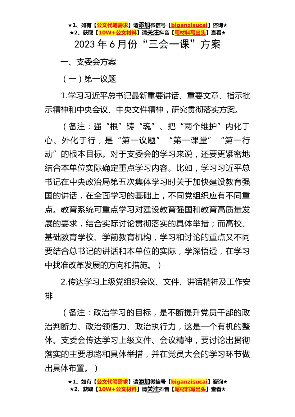 ★1、如有【公文代笔需求】请添加微信号【biganzisucai】咨询★★2、获取【10W+公文材料】请关注抖音【写材料写出头】查看★★1、如有【公文代笔需求】请添加微信号【biganzisucai】咨询★★2、获取【10W+公文材料】请关注抖音【写材料写出头】查看★★1、如有【公文代笔需求】请添加微信号【biganzisucai】咨询★★2、获取【10W+公文材料】请关注抖音【写材料写出头】查看★2023年6月份“三会一课”方案一、支委会方案(一)第一议题1.学习习近平总书记最新重要讲话、重要文章、指示批示精神和中央会议、中央文件精神,研究贯彻落实方案。(备注:强“根”铸“魂”、把“两个维护”内化于心、外化于行,是“第一议题”“第一课堂”“第一行动”的根本目标。对于支委会的学习来说,还要更紧密地结合本单位实际确定...