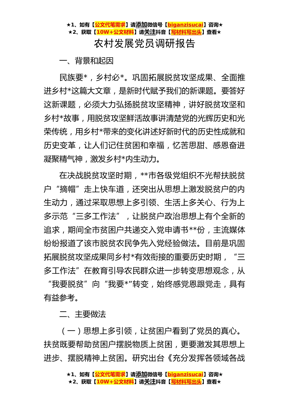 ★1、如有【公文代笔需求】请添加微信号【biganzisucai】咨询★★2、获取【10W+公文材料】请关注抖音【写材料写出头】查看★★1、如有【公文代笔需求】请添加微信号【biganzisucai】咨询★★2、获取【10W+公文材料】请关注抖音【写材料写出头】查看★★1、如有【公文代笔需求】请添加微信号【biganzisucai】咨询★★2、获取【10W+公文材料】请关注抖音【写材料写出头】查看★农村发展党员调研报告一、背景和起因民族要*,乡村必*。巩固拓展脱贫攻坚成果、全面推进乡村*这篇大文章,是新时代赋予我们的新课题。要答好这新课题,必须大力弘扬脱贫攻坚精神,讲好脱贫攻坚和乡村*故事,用脱贫攻坚鲜活故事讲清楚党的光辉历史和光荣传统,用乡村*带来的变化讲述好新时代的历史性成就和历史变革,让人们记住贫困和幸福,...