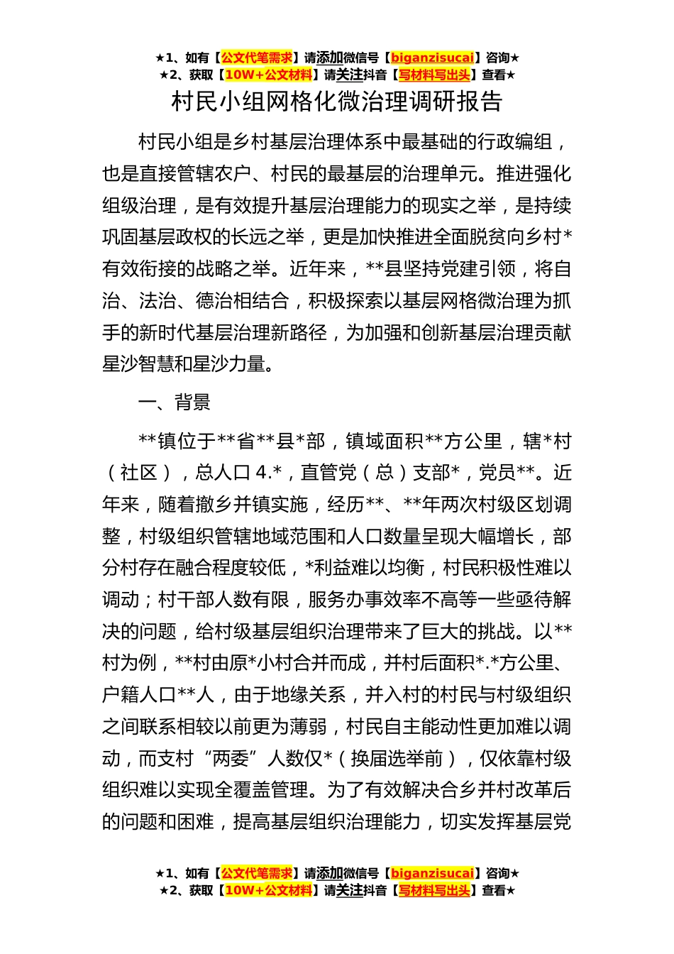 ★1、如有【公文代笔需求】请添加微信号【biganzisucai】咨询★★2、获取【10W+公文材料】请关注抖音【写材料写出头】查看★★1、如有【公文代笔需求】请添加微信号【biganzisucai】咨询★★2、获取【10W+公文材料】请关注抖音【写材料写出头】查看★★1、如有【公文代笔需求】请添加微信号【biganzisucai】咨询★★2、获取【10W+公文材料】请关注抖音【写材料写出头】查看★村民小组网格化微治理调研报告村民小组是乡村基层治理体系中最基础的行政编组,也是直接管辖农户、村民的最基层的治理单元。推进强化组级治理,是有效提升基层治理能力的现实之举,是持续巩固基层政权的长远之举,更是加快推进全面脱贫向乡村*有效衔接的战略之举。近年来,**县坚持党建引领,将自治、法治、德治相结合,积极探索以基层网格...