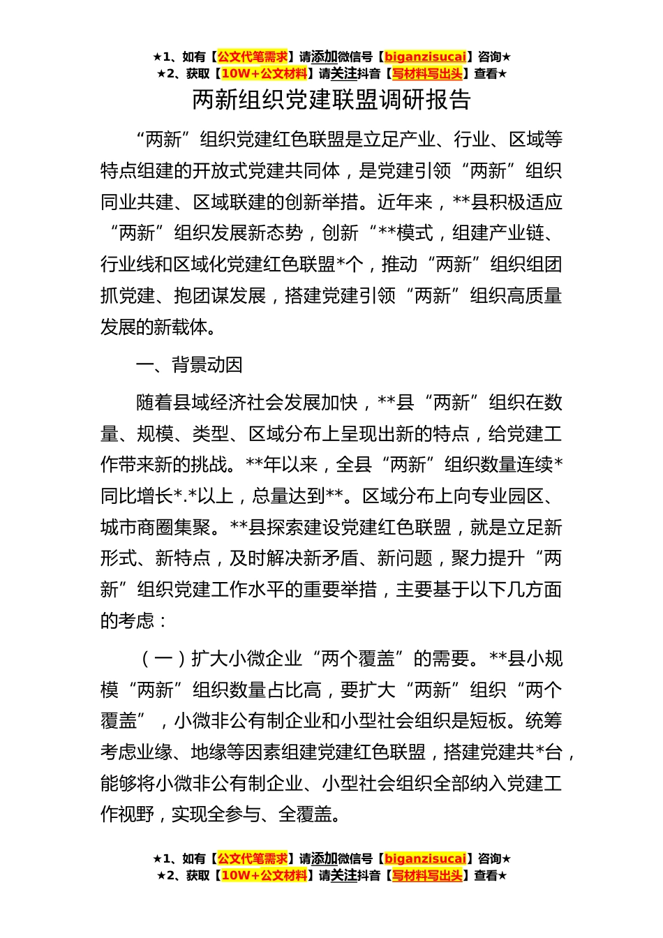 ★1、如有【公文代笔需求】请添加微信号【biganzisucai】咨询★★2、获取【10W+公文材料】请关注抖音【写材料写出头】查看★★1、如有【公文代笔需求】请添加微信号【biganzisucai】咨询★★2、获取【10W+公文材料】请关注抖音【写材料写出头】查看★★1、如有【公文代笔需求】请添加微信号【biganzisucai】咨询★★2、获取【10W+公文材料】请关注抖音【写材料写出头】查看★两新组织党建联盟调研报告“两新”组织党建红色联盟是立足产业、行业、区域等特点组建的开放式党建共同体,是党建引领“两新”组织同业共建、区域联建的创新举措。近年来,**县积极适应“两新”组织发展新态势,创新“**模式,组建产业链、行业线和区域化党建红色联盟*个,推动“两新”组织组团抓党建、抱团谋发展,搭建党建引领“两新”组...