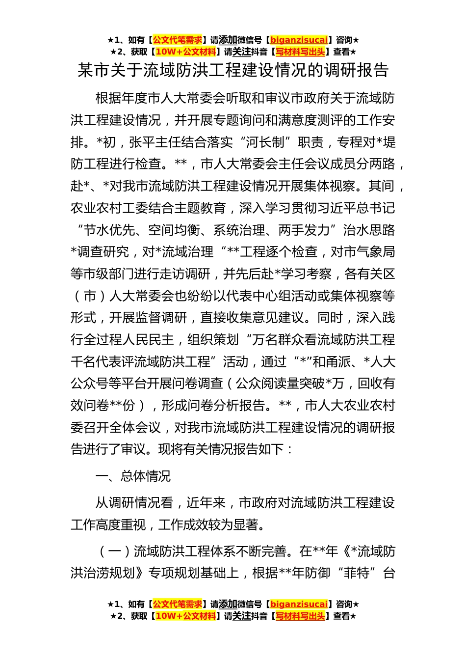 ★1、如有【公文代笔需求】请添加微信号【biganzisucai】咨询★★2、获取【10W+公文材料】请关注抖音【写材料写出头】查看★★1、如有【公文代笔需求】请添加微信号【biganzisucai】咨询★★2、获取【10W+公文材料】请关注抖音【写材料写出头】查看★★1、如有【公文代笔需求】请添加微信号【biganzisucai】咨询★★2、获取【10W+公文材料】请关注抖音【写材料写出头】查看★某市关于流域防洪工程建设情况的调研报告根据年度市人大常委会听取和审议市政府关于流域防洪工程建设情况,并开展专题询问和满意度测评的工作安排。*初,张平主任结合落实“河长制”职责,专程对*堤防工程进行检查。**,市人大常委会主任会议成员分两路,赴*、*对我市流域防洪工程建设情况开展集体视察。其间,农业农村工委结合主题教育,...