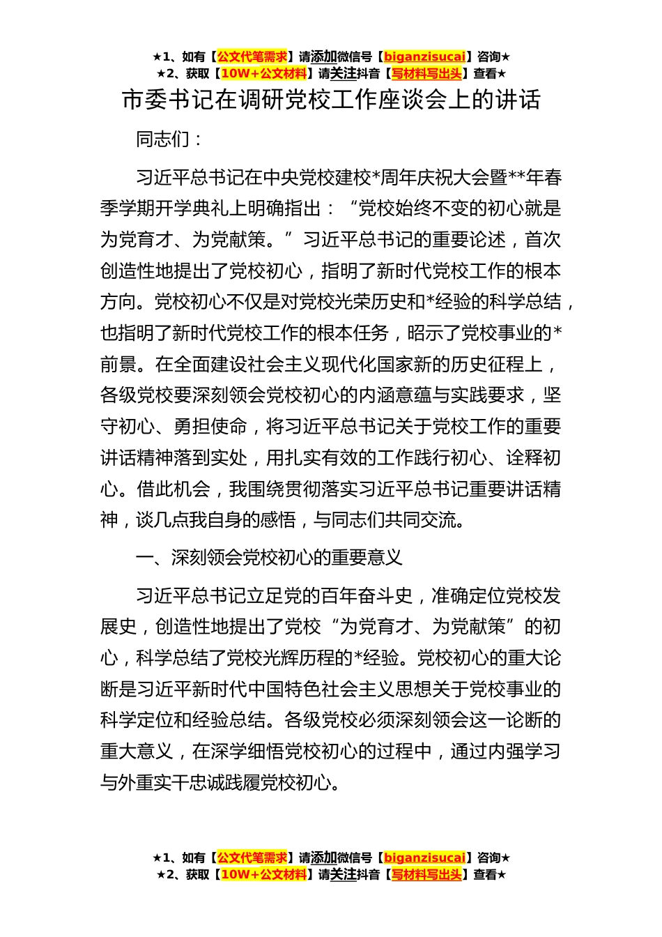 ★1、如有【公文代笔需求】请添加微信号【biganzisucai】咨询★★2、获取【10W+公文材料】请关注抖音【写材料写出头】查看★★1、如有【公文代笔需求】请添加微信号【biganzisucai】咨询★★2、获取【10W+公文材料】请关注抖音【写材料写出头】查看★★1、如有【公文代笔需求】请添加微信号【biganzisucai】咨询★★2、获取【10W+公文材料】请关注抖音【写材料写出头】查看★市委书记在调研党校工作座谈会上的讲话同志们:习近平总书记在中央党校建校*周年庆祝大会暨**年春季学期开学典礼上明确指出:“党校始终不变的初心就是为党育才、为党献策。”习近平总书记的重要论述,首次创造性地提出了党校初心,指明了新时代党校工作的根本方向。党校初心不仅是对党校光荣历史和*经验的科学总结,也指明了新时代党校工...