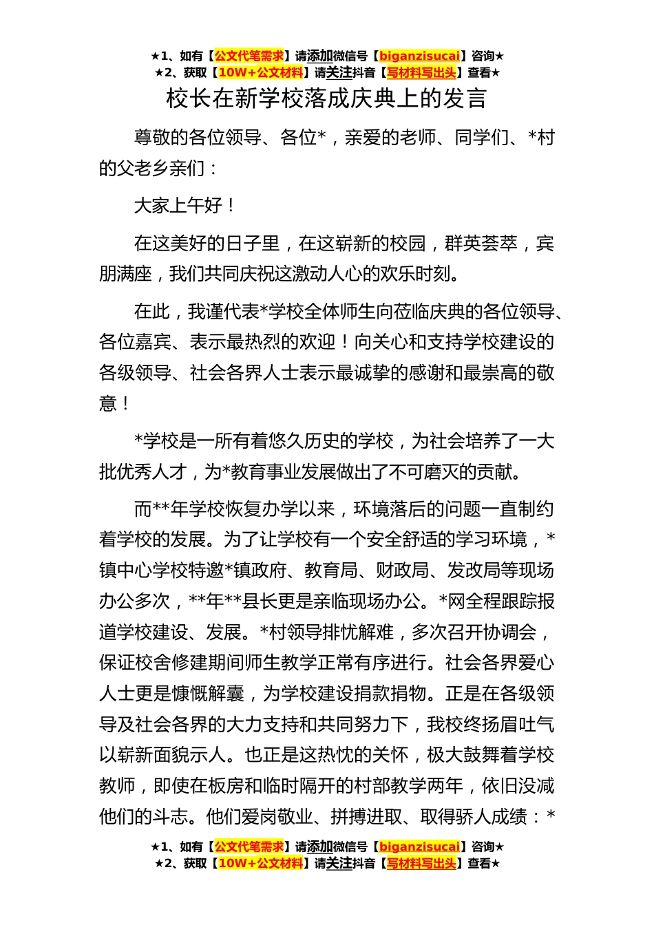 ★1、如有【公文代笔需求】请添加微信号【biganzisucai】咨询★★2、获取【10W+公文材料】请关注抖音【写材料写出头】查看★★1、如有【公文代笔需求】请添加微信号【biganzisucai】咨询★★2、获取【10W+公文材料】请关注抖音【写材料写出头】查看★★1、如有【公文代笔需求】请添加微信号【biganzisucai】咨询★★2、获取【10W+公文材料】请关注抖音【写材料写出头】查看★校长在新学校落成庆典上的发言尊敬的各位领导、各位*,亲爱的老师、同学们、*村的父老乡亲们:大家上午好!在这美好的日子里,在这崭新的校园,群英荟萃,宾朋满座,我们共同庆祝这激动人心的欢乐时刻。在此,我谨代表*学校全体师生向莅临庆典的各位领导、各位嘉宾、表示最热烈的欢迎!向关心和支持学校建设的各级领导、社会各界人士表示最...