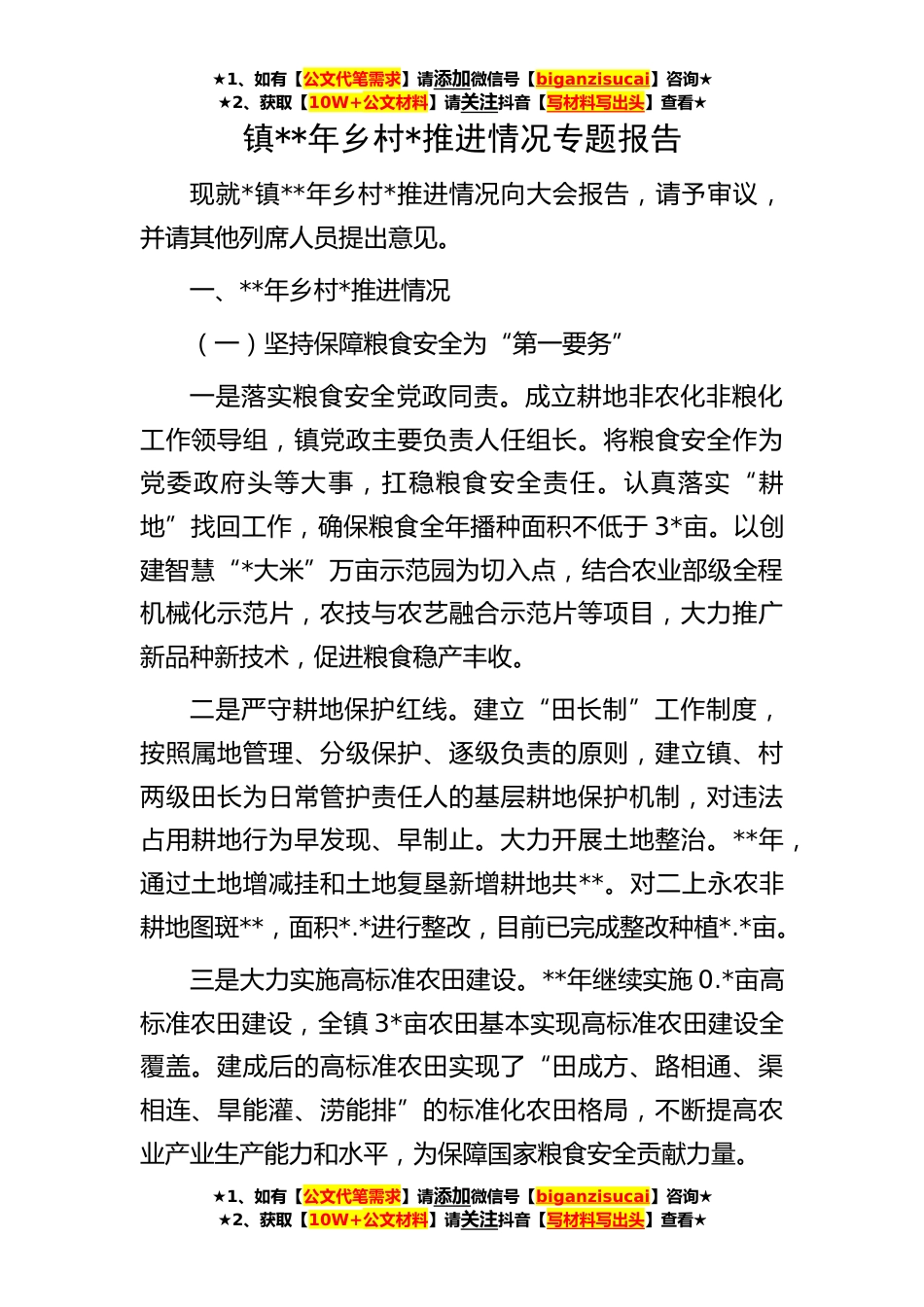★1、如有【公文代笔需求】请添加微信号【biganzisucai】咨询★★2、获取【10W+公文材料】请关注抖音【写材料写出头】查看★★1、如有【公文代笔需求】请添加微信号【biganzisucai】咨询★★2、获取【10W+公文材料】请关注抖音【写材料写出头】查看★★1、如有【公文代笔需求】请添加微信号【biganzisucai】咨询★★2、获取【10W+公文材料】请关注抖音【写材料写出头】查看★镇**年乡村*推进情况专题报告现就*镇**年乡村*推进情况向大会报告,请予审议,并请其他列席人员提出意见。一、**年乡村*推进情况(一)坚持保障粮食安全为“第一要务”一是落实粮食安全党政同责。成立耕地非农化非粮化工作领导组,镇党政主要负责人任组长。将粮食安全作为党委政府头等大事,扛稳粮食安全责任。认真落实“耕地”找回工作,...