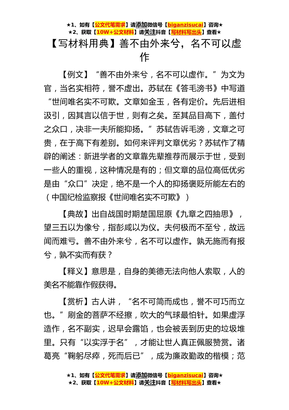 ★1、如有【公文代笔需求】请添加微信号【biganzisucai】咨询★★2、获取【10W+公文材料】请关注抖音【写材料写出头】查看★★1、如有【公文代笔需求】请添加微信号【biganzisucai】咨询★★2、获取【10W+公文材料】请关注抖音【写材料写出头】查看★★1、如有【公文代笔需求】请添加微信号【biganzisucai】咨询★★2、获取【10W+公文材料】请关注抖音【写材料写出头】查看★【写材料用典】善不由外来兮,名不可以虚作【例文】“善不由外来兮,名不可以虚作。”为文为官,当名实相符,誉不虚出。苏轼在《答毛滂书》中写道“世间唯名实不可欺。文章如金玉,各有定价。先后进相汲引,因其言以信于世,则有之矣。至其品目高下,盖付之众口,决非一夫所能抑扬。”苏轼告诉毛滂,文章之可贵,在于高下有差别。如何来评...
