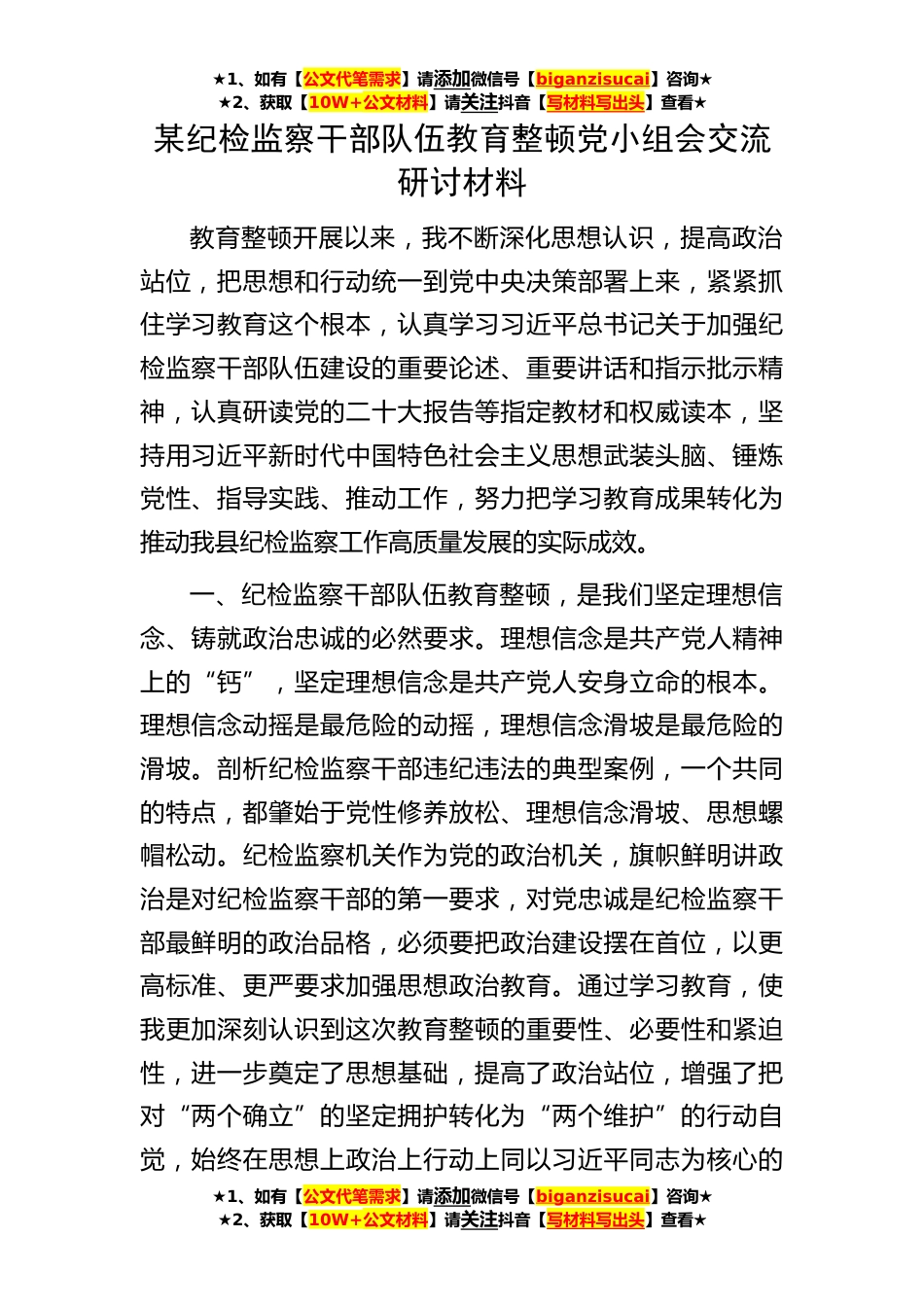 ★1、如有【公文代笔需求】请添加微信号【biganzisucai】咨询★★2、获取【10W+公文材料】请关注抖音【写材料写出头】查看★★1、如有【公文代笔需求】请添加微信号【biganzisucai】咨询★★2、获取【10W+公文材料】请关注抖音【写材料写出头】查看★★1、如有【公文代笔需求】请添加微信号【biganzisucai】咨询★★2、获取【10W+公文材料】请关注抖音【写材料写出头】查看★某纪检监察干部队伍教育整顿党小组会交流研讨材料教育整顿开展以来,我不断深化思想认识,提高政治站位,把思想和行动统一到党中央决策部署上来,紧紧抓住学习教育这个根本,认真学习习近平总书记关于加强纪检监察干部队伍建设的重要论述、重要讲话和指示批示精神,认真研读党的二十大报告等指定教材和权威读本,坚持用习近平新时代中国特...