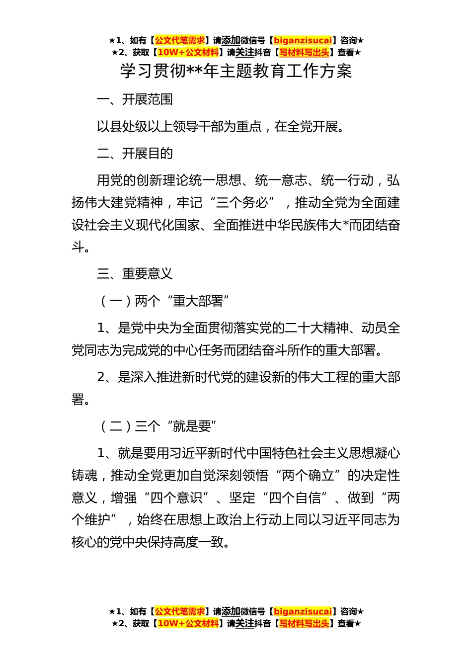 ★1、如有【公文代笔需求】请添加微信号【biganzisucai】咨询★★2、获取【10W+公文材料】请关注抖音【写材料写出头】查看★★1、如有【公文代笔需求】请添加微信号【biganzisucai】咨询★★2、获取【10W+公文材料】请关注抖音【写材料写出头】查看★★1、如有【公文代笔需求】请添加微信号【biganzisucai】咨询★★2、获取【10W+公文材料】请关注抖音【写材料写出头】查看★学习贯彻**年主题教育工作方案一、开展范围以县处级以上领导干部为重点,在全党开展。二、开展目的用党的创新理论统一思想、统一意志、统一行动,弘扬伟大建党精神,牢记“三个务必”,推动全党为全面建设社会主义现代化国家、全面推进中华民族伟大*而团结奋斗。三、重要意义(一)两个“重大部署”1、是党中央为全面贯彻落实党的二十大精...