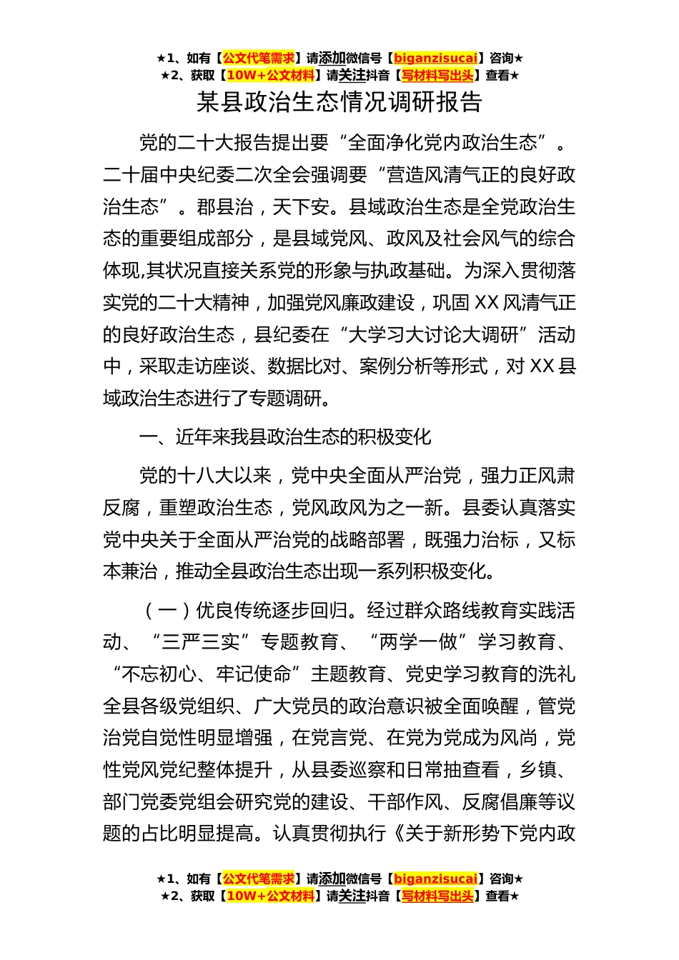 ★1、如有【公文代笔需求】请添加微信号【biganzisucai】咨询★★2、获取【10W+公文材料】请关注抖音【写材料写出头】查看★★1、如有【公文代笔需求】请添加微信号【biganzisucai】咨询★★2、获取【10W+公文材料】请关注抖音【写材料写出头】查看★★1、如有【公文代笔需求】请添加微信号【biganzisucai】咨询★★2、获取【10W+公文材料】请关注抖音【写材料写出头】查看★某县政治生态情况调研报告党的二十大报告提出要“全面净化党内政治生态”。二十届中央纪委二次全会强调要“营造风清气正的良好政治生态”。郡县治,天下安。县域政治生态是全党政治生态的重要组成部分,是县域党风、政风及社会风气的综合体现,其状况直接关系党的形象与执政基础。为深入贯彻落实党的二十大精神,加强党风廉政建设,巩固XX风...