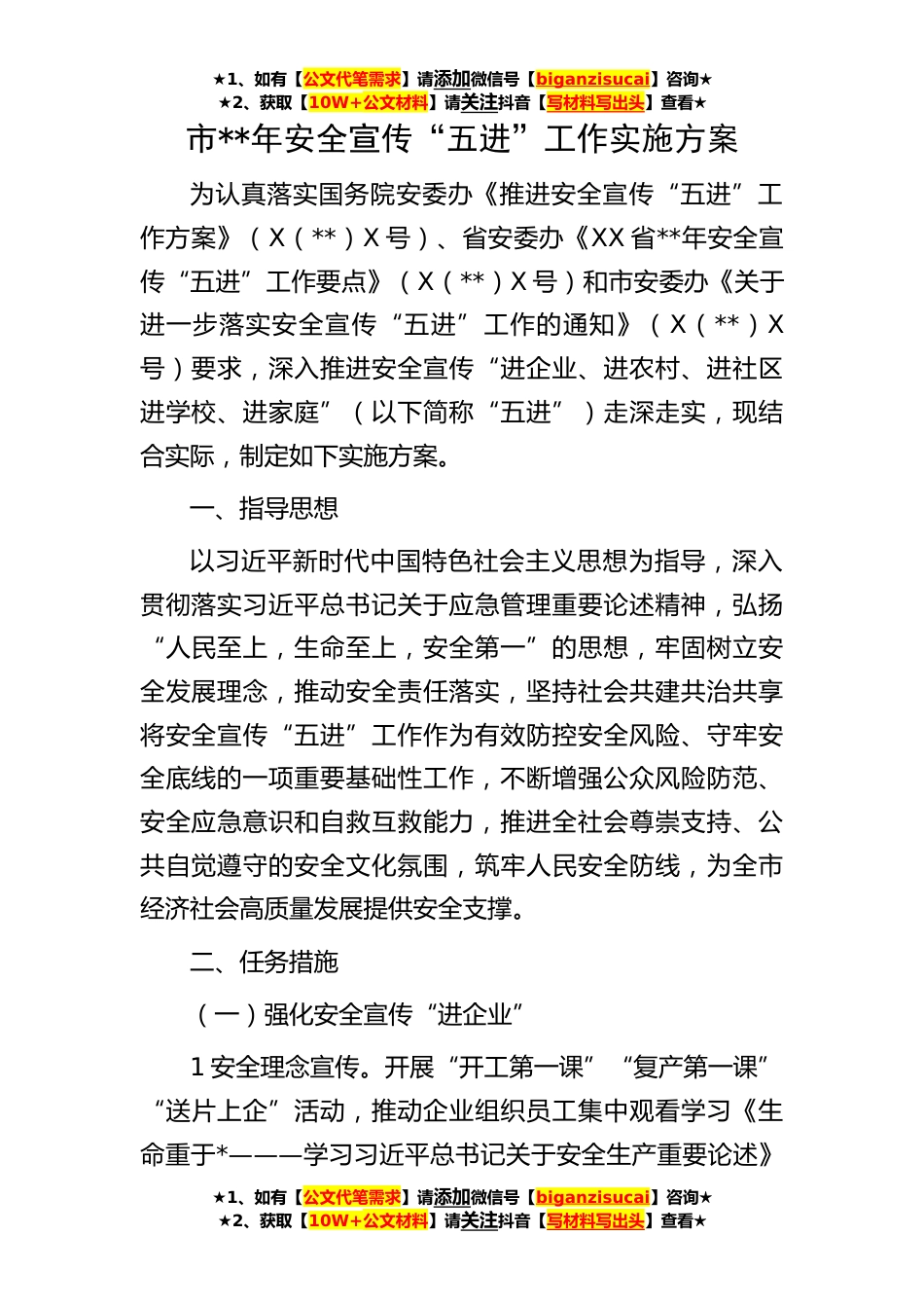 ★1、如有【公文代笔需求】请添加微信号【biganzisucai】咨询★★2、获取【10W+公文材料】请关注抖音【写材料写出头】查看★★1、如有【公文代笔需求】请添加微信号【biganzisucai】咨询★★2、获取【10W+公文材料】请关注抖音【写材料写出头】查看★★1、如有【公文代笔需求】请添加微信号【biganzisucai】咨询★★2、获取【10W+公文材料】请关注抖音【写材料写出头】查看★市**年安全宣传“五进”工作实施方案为认真落实国务院安委办《推进安全宣传“五进”工作方案》(X(**)X号)、省安委办《XX省**年安全宣传“五进”工作要点》(X(**)X号)和市安委办《关于进一步落实安全宣传“五进”工作的通知》(X(**)X号)要求,深入推进安全宣传“进企业、进农村、进社区进学校、进家庭”(以下简称“五进”)走...
