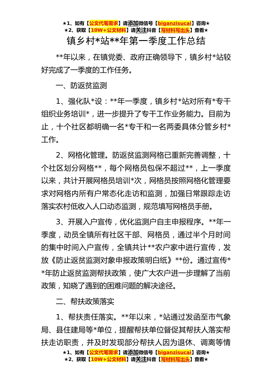 ★1、如有【公文代笔需求】请添加微信号【biganzisucai】咨询★★2、获取【10W+公文材料】请关注抖音【写材料写出头】查看★★1、如有【公文代笔需求】请添加微信号【biganzisucai】咨询★★2、获取【10W+公文材料】请关注抖音【写材料写出头】查看★★1、如有【公文代笔需求】请添加微信号【biganzisucai】咨询★★2、获取【10W+公文材料】请关注抖音【写材料写出头】查看★镇乡村*站**年第一季度工作总结**年以来,在镇党委、政府正确领导下,镇乡村*站较好完成了一季度的工作任务。一、防返贫监测1、强化队*设:**年一季度,镇乡村*站对所有*专干组织业务培训*,进一步提升了专干工作业务能力。目前为止,十个社区都明确一名*专干和一名两委具体分管乡村*工作。2、网格化管理。防返贫监测网格已重新完善调整,...