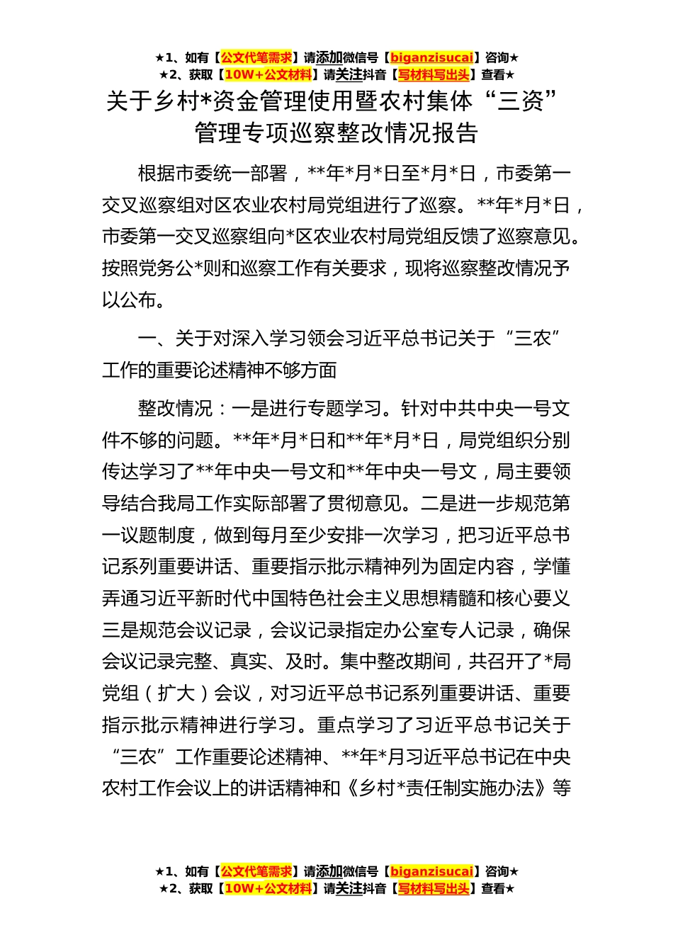 ★1、如有【公文代笔需求】请添加微信号【biganzisucai】咨询★★2、获取【10W+公文材料】请关注抖音【写材料写出头】查看★★1、如有【公文代笔需求】请添加微信号【biganzisucai】咨询★★2、获取【10W+公文材料】请关注抖音【写材料写出头】查看★★1、如有【公文代笔需求】请添加微信号【biganzisucai】咨询★★2、获取【10W+公文材料】请关注抖音【写材料写出头】查看★关于乡村*资金管理使用暨农村集体“三资”管理专项巡察整改情况报告根据市委统一部署,**年*月*日至*月*日,市委第一交叉巡察组对区农业农村局党组进行了巡察。**年*月*日,市委第一交叉巡察组向*区农业农村局党组反馈了巡察意见。按照党务公*则和巡察工作有关要求,现将巡察整改情况予以公布。一、关于对深入学习领会习近平总书记关于“三...