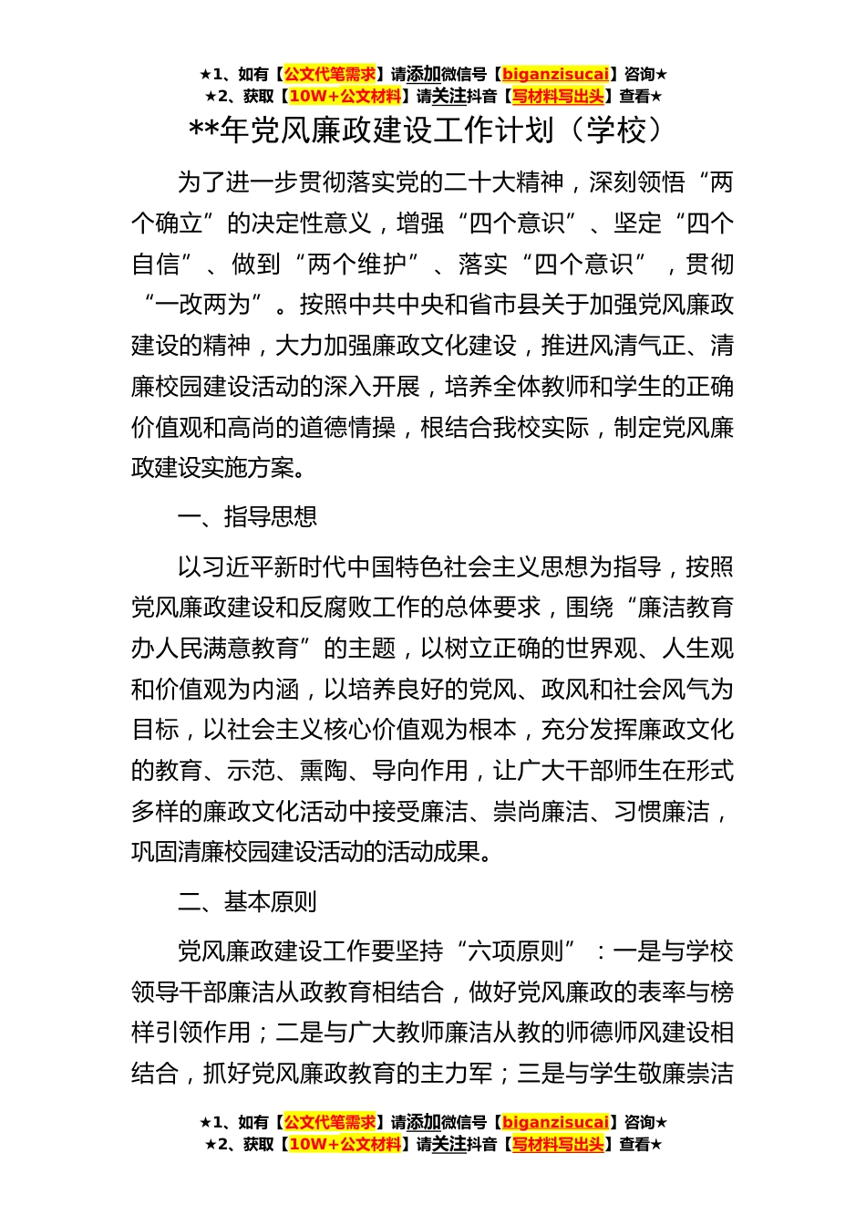 ★1、如有【公文代笔需求】请添加微信号【biganzisucai】咨询★★2、获取【10W+公文材料】请关注抖音【写材料写出头】查看★★1、如有【公文代笔需求】请添加微信号【biganzisucai】咨询★★2、获取【10W+公文材料】请关注抖音【写材料写出头】查看★★1、如有【公文代笔需求】请添加微信号【biganzisucai】咨询★★2、获取【10W+公文材料】请关注抖音【写材料写出头】查看★**年党风廉政建设工作计划(学校)为了进一步贯彻落实党的二十大精神,深刻领悟“两个确立”的决定性意义,增强“四个意识”、坚定“四个自信”、做到“两个维护”、落实“四个意识”,贯彻“一改两为”。按照中共中央和省市县关于加强党风廉政建设的精神,大力加强廉政文化建设,推进风清气正、清廉校园建设活动的深入开展,培养全体教师...