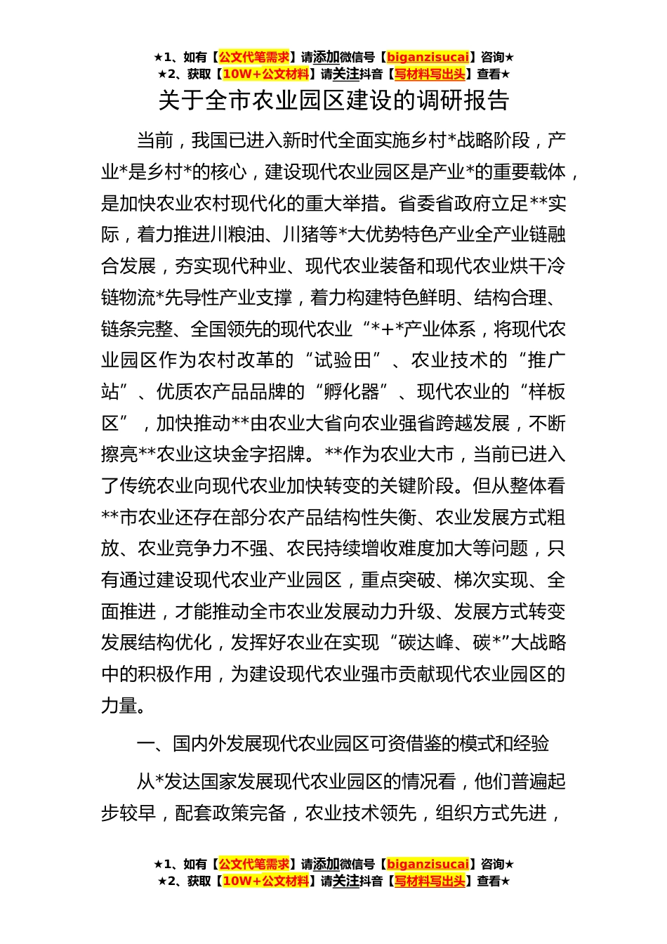 ★1、如有【公文代笔需求】请添加微信号【biganzisucai】咨询★★2、获取【10W+公文材料】请关注抖音【写材料写出头】查看★★1、如有【公文代笔需求】请添加微信号【biganzisucai】咨询★★2、获取【10W+公文材料】请关注抖音【写材料写出头】查看★★1、如有【公文代笔需求】请添加微信号【biganzisucai】咨询★★2、获取【10W+公文材料】请关注抖音【写材料写出头】查看★关于全市农业园区建设的调研报告当前,我国已进入新时代全面实施乡村*战略阶段,产业*是乡村*的核心,建设现代农业园区是产业*的重要载体,是加快农业农村现代化的重大举措。省委省政府立足**实际,着力推进川粮油、川猪等*大优势特色产业全产业链融合发展,夯实现代种业、现代农业装备和现代农业烘干冷链物流*先导性产业支撑,着力构建特...
