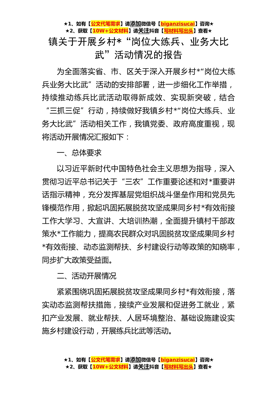 ★1、如有【公文代笔需求】请添加微信号【biganzisucai】咨询★★2、获取【10W+公文材料】请关注抖音【写材料写出头】查看★★1、如有【公文代笔需求】请添加微信号【biganzisucai】咨询★★2、获取【10W+公文材料】请关注抖音【写材料写出头】查看★★1、如有【公文代笔需求】请添加微信号【biganzisucai】咨询★★2、获取【10W+公文材料】请关注抖音【写材料写出头】查看★镇关于开展乡村*“岗位大练兵、业务大比武”活动情况的报告为全面落实省、市、区关于深入开展乡村*“岗位大练兵业务大比武”活动的安排部署,进一步细化工作举措,持续推动练兵比武活动取得新成效、实现新突破,结合“三抓三促”行动,持续做好我镇乡村*“岗位大练兵、业务大比武”活动相关工作,我镇党委、政府高度重视,现将活动开展情况...