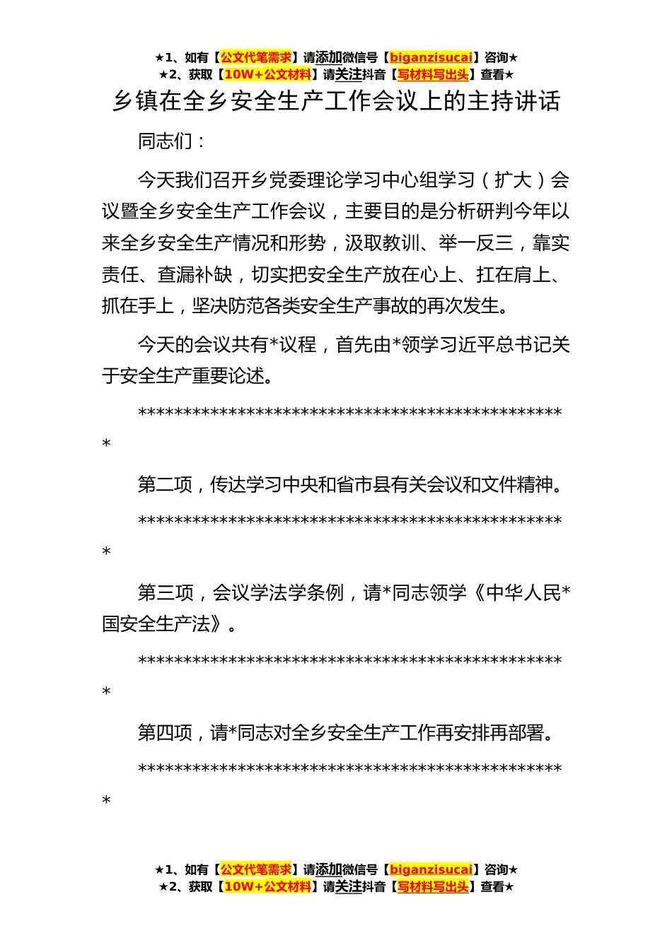 ★1、如有【公文代笔需求】请添加微信号【biganzisucai】咨询★★2、获取【10W+公文材料】请关注抖音【写材料写出头】查看★★1、如有【公文代笔需求】请添加微信号【biganzisucai】咨询★★2、获取【10W+公文材料】请关注抖音【写材料写出头】查看★★1、如有【公文代笔需求】请添加微信号【biganzisucai】咨询★★2、获取【10W+公文材料】请关注抖音【写材料写出头】查看★乡镇在全乡安全生产工作会议上的主持讲话同志们:今天我们召开乡党委理论学习中心组学习(扩大)会议暨全乡安全生产工作会议,主要目的是分析研判今年以来全乡安全生产情况和形势,汲取教训、举一反三,靠实责任、查漏补缺,切实把安全生产放在心上、扛在肩上、抓在手上,坚决防范各类安全生产事故的再次发生。今天的会议共有*议程,首先由...