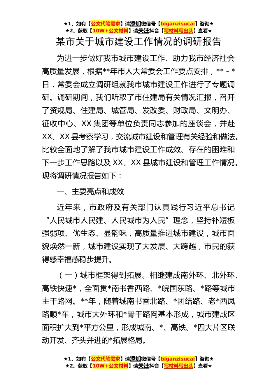 ★1、如有【公文代笔需求】请添加微信号【biganzisucai】咨询★★2、获取【10W+公文材料】请关注抖音【写材料写出头】查看★★1、如有【公文代笔需求】请添加微信号【biganzisucai】咨询★★2、获取【10W+公文材料】请关注抖音【写材料写出头】查看★★1、如有【公文代笔需求】请添加微信号【biganzisucai】咨询★★2、获取【10W+公文材料】请关注抖音【写材料写出头】查看★某市关于城市建设工作情况的调研报告为进一步做好我市城市建设工作、助力我市经济社会高质量发展,根据**年市人大常委会工作要点安排,**-*日,常委会成立调研组就我市城市建设工作进行了专题调研。调研期间,我们听取了市住建局有关情况汇报,召开了资规局、住建局、城管局、发改委、财政局、文明办、征收中心、XX集团等单位负责同志参加...
