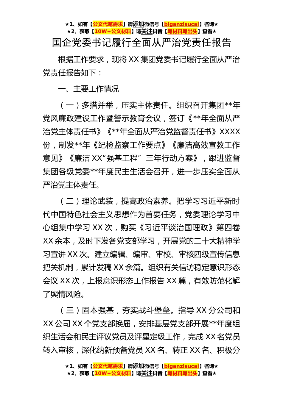 ★1、如有【公文代笔需求】请添加微信号【biganzisucai】咨询★★2、获取【10W+公文材料】请关注抖音【写材料写出头】查看★★1、如有【公文代笔需求】请添加微信号【biganzisucai】咨询★★2、获取【10W+公文材料】请关注抖音【写材料写出头】查看★★1、如有【公文代笔需求】请添加微信号【biganzisucai】咨询★★2、获取【10W+公文材料】请关注抖音【写材料写出头】查看★国企党委书记履行全面从严治党责任报告根据工作要求,现将XX集团党委书记履行全面从严治党责任报告如下:一、主要工作情况(一)多措并举,压实主体责任。组织召开集团**年党风廉政建设工作暨警示教育会议,签订《**年全面从严治党主体责任书》《**年全面从严治党监督责任书》XXXX份,制发**年《纪检监察工作要点》《廉洁高效宣教工作意见...