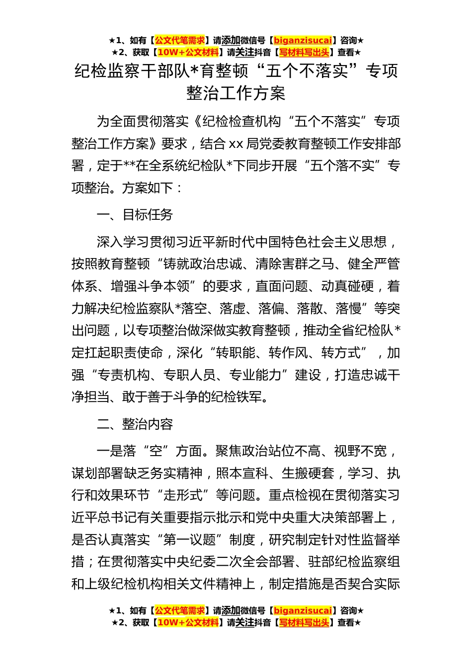 ★1、如有【公文代笔需求】请添加微信号【biganzisucai】咨询★★2、获取【10W+公文材料】请关注抖音【写材料写出头】查看★★1、如有【公文代笔需求】请添加微信号【biganzisucai】咨询★★2、获取【10W+公文材料】请关注抖音【写材料写出头】查看★★1、如有【公文代笔需求】请添加微信号【biganzisucai】咨询★★2、获取【10W+公文材料】请关注抖音【写材料写出头】查看★纪检监察干部队*育整顿“五个不落实”专项整治工作方案为全面贯彻落实《纪检检查机构“五个不落实”专项整治工作方案》要求,结合xx局党委教育整顿工作安排部署,定于**在全系统纪检队*下同步开展“五个落不实”专项整治。方案如下:一、目标任务深入学习贯彻习近平新时代中国特色社会主义思想,按照教育整顿“铸就政治忠诚、清除害群之马...