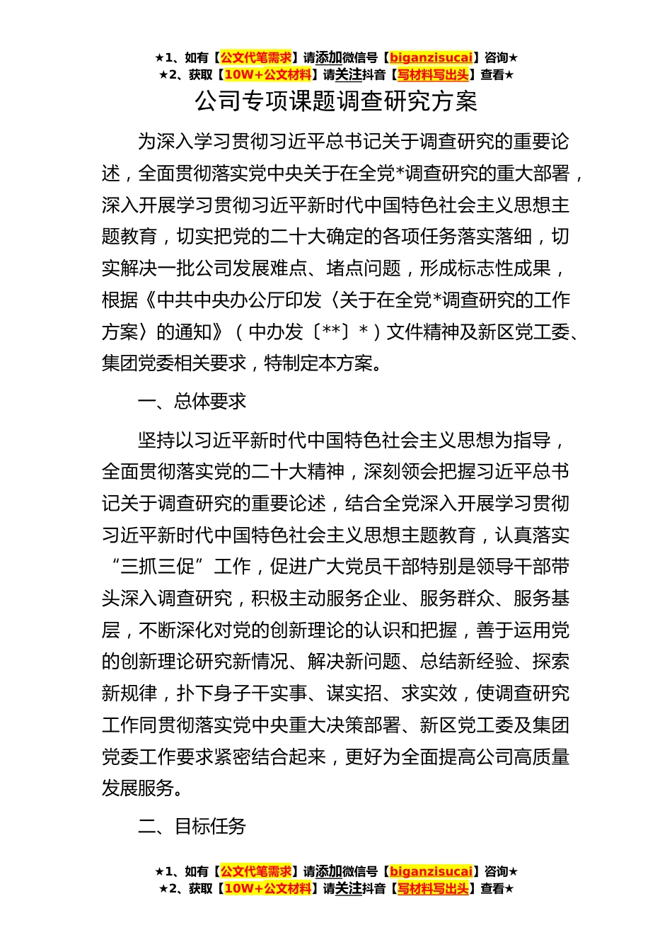 ★1、如有【公文代笔需求】请添加微信号【biganzisucai】咨询★★2、获取【10W+公文材料】请关注抖音【写材料写出头】查看★★1、如有【公文代笔需求】请添加微信号【biganzisucai】咨询★★2、获取【10W+公文材料】请关注抖音【写材料写出头】查看★★1、如有【公文代笔需求】请添加微信号【biganzisucai】咨询★★2、获取【10W+公文材料】请关注抖音【写材料写出头】查看★公司专项课题调查研究方案为深入学习贯彻习近平总书记关于调查研究的重要论述,全面贯彻落实党中央关于在全党*调查研究的重大部署,深入开展学习贯彻习近平新时代中国特色社会主义思想主题教育,切实把党的二十大确定的各项任务落实落细,切实解决一批公司发展难点、堵点问题,形成标志性成果,根据《中共中央办公厅印发〈关于在全党*调查...
