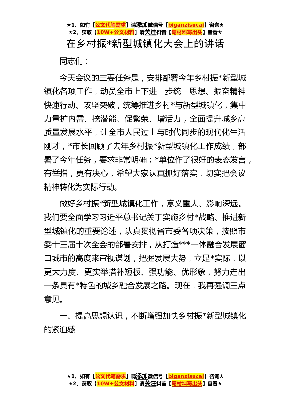★1、如有【公文代笔需求】请添加微信号【biganzisucai】咨询★★2、获取【10W+公文材料】请关注抖音【写材料写出头】查看★★1、如有【公文代笔需求】请添加微信号【biganzisucai】咨询★★2、获取【10W+公文材料】请关注抖音【写材料写出头】查看★★1、如有【公文代笔需求】请添加微信号【biganzisucai】咨询★★2、获取【10W+公文材料】请关注抖音【写材料写出头】查看★在乡村振*新型城镇化大会上的讲话同志们:今天会议的主要任务是,安排部署今年乡村振*新型城镇化各项工作,动员全市上下进一步统一思想、振奋精神快速行动、攻坚突破,统筹推进乡村*与新型城镇化,集中力量扩内需、挖潜能、促繁荣、增活力,全面提升城乡高质量发展水平,让全市人民过上与时代同步的现代化生活刚才,*市长回顾了去年乡村振*...
