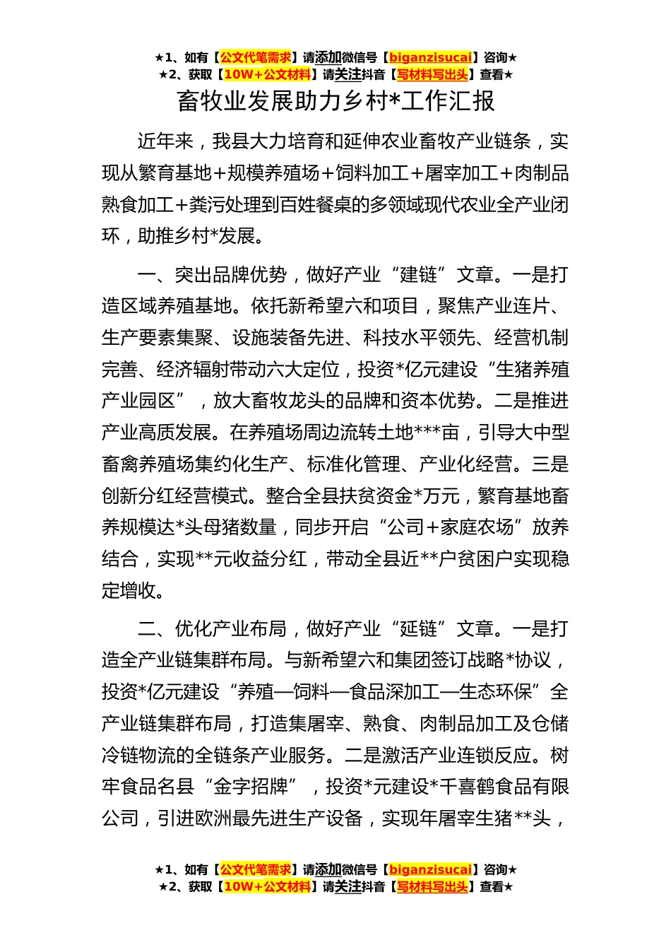 ★1、如有【公文代笔需求】请添加微信号【biganzisucai】咨询★★2、获取【10W+公文材料】请关注抖音【写材料写出头】查看★★1、如有【公文代笔需求】请添加微信号【biganzisucai】咨询★★2、获取【10W+公文材料】请关注抖音【写材料写出头】查看★★1、如有【公文代笔需求】请添加微信号【biganzisucai】咨询★★2、获取【10W+公文材料】请关注抖音【写材料写出头】查看★畜牧业发展助力乡村*工作汇报近年来,我县大力培育和延伸农业畜牧产业链条,实现从繁育基地+规模养殖场+饲料加工+屠宰加工+肉制品熟食加工+粪污处理到百姓餐桌的多领域现代农业全产业闭环,助推乡村*发展。一、突出品牌优势,做好产业“建链”文章。一是打造区域养殖基地。依托新希望六和项目,聚焦产业连片、生产要素集聚、设施装备先进、...