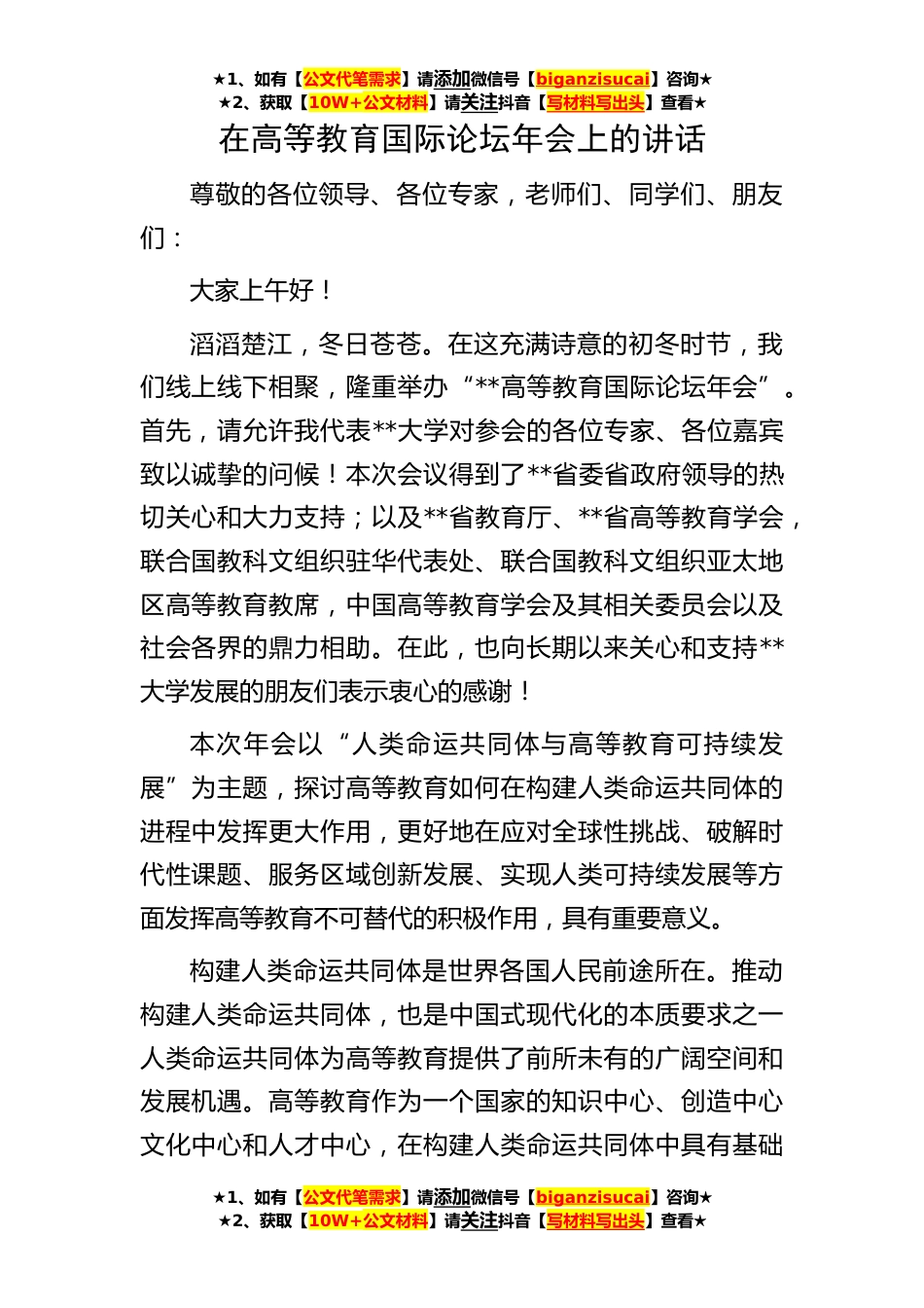 ★1、如有【公文代笔需求】请添加微信号【biganzisucai】咨询★★2、获取【10W+公文材料】请关注抖音【写材料写出头】查看★★1、如有【公文代笔需求】请添加微信号【biganzisucai】咨询★★2、获取【10W+公文材料】请关注抖音【写材料写出头】查看★★1、如有【公文代笔需求】请添加微信号【biganzisucai】咨询★★2、获取【10W+公文材料】请关注抖音【写材料写出头】查看★在高等教育国际论坛年会上的讲话尊敬的各位领导、各位专家,老师们、同学们、朋友们:大家上午好!滔滔楚江,冬日苍苍。在这充满诗意的初冬时节,我们线上线下相聚,隆重举办“**高等教育国际论坛年会”。首先,请允许我代表**大学对参会的各位专家、各位嘉宾致以诚挚的问候!本次会议得到了**省委省政府领导的热切关心和大力支持;以及**...