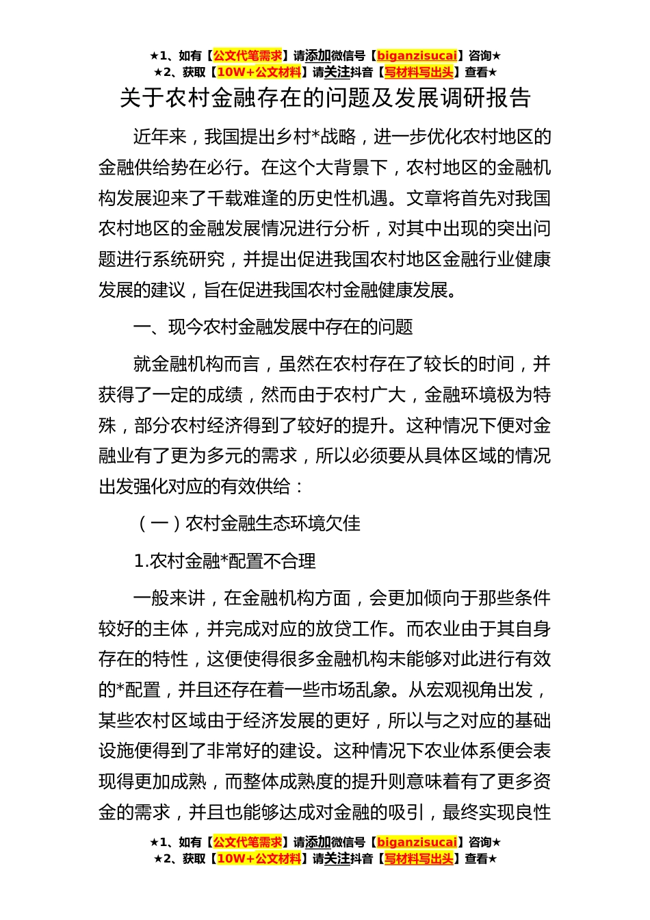 ★1、如有【公文代笔需求】请添加微信号【biganzisucai】咨询★★2、获取【10W+公文材料】请关注抖音【写材料写出头】查看★★1、如有【公文代笔需求】请添加微信号【biganzisucai】咨询★★2、获取【10W+公文材料】请关注抖音【写材料写出头】查看★★1、如有【公文代笔需求】请添加微信号【biganzisucai】咨询★★2、获取【10W+公文材料】请关注抖音【写材料写出头】查看★关于农村金融存在的问题及发展调研报告近年来,我国提出乡村*战略,进一步优化农村地区的金融供给势在必行。在这个大背景下,农村地区的金融机构发展迎来了千载难逢的历史性机遇。文章将首先对我国农村地区的金融发展情况进行分析,对其中出现的突出问题进行系统研究,并提出促进我国农村地区金融行业健康发展的建议,旨在促进我国农村金融...