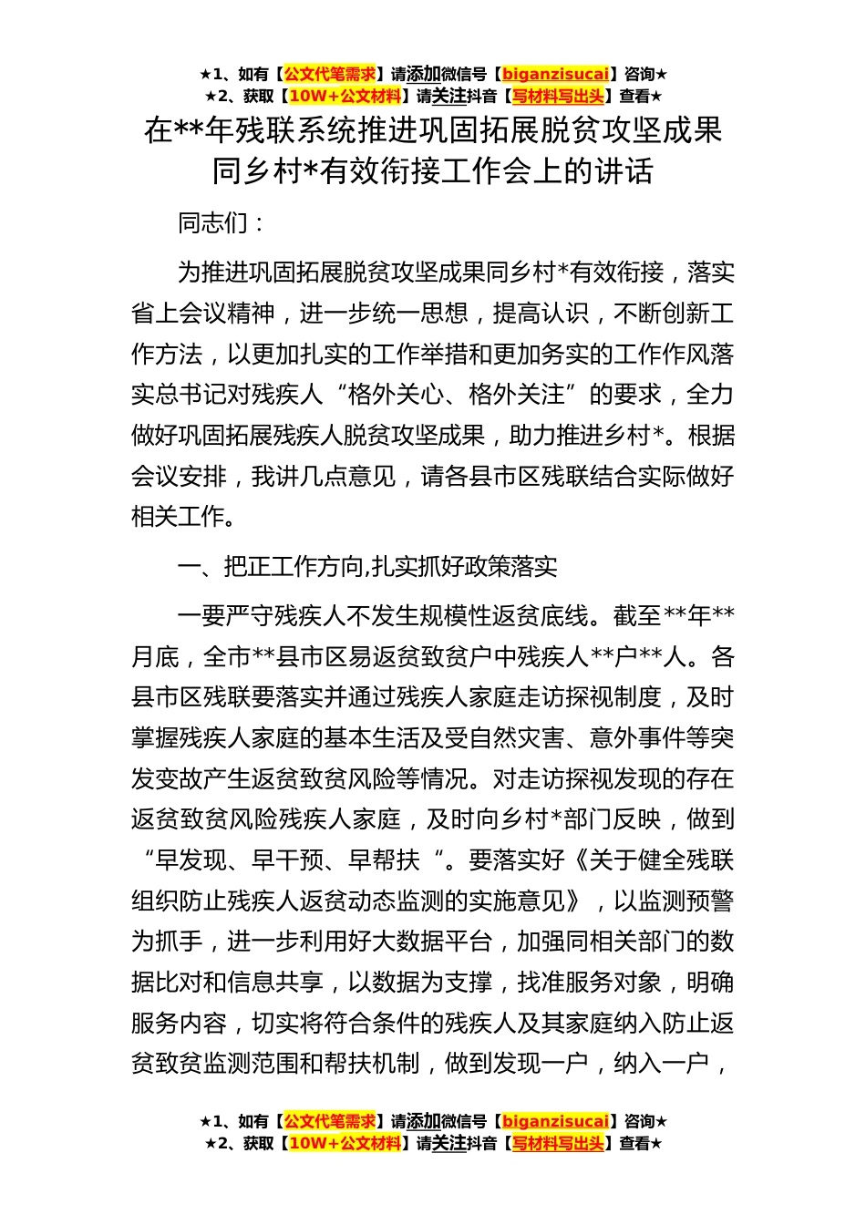 ★1、如有【公文代笔需求】请添加微信号【biganzisucai】咨询★★2、获取【10W+公文材料】请关注抖音【写材料写出头】查看★★1、如有【公文代笔需求】请添加微信号【biganzisucai】咨询★★2、获取【10W+公文材料】请关注抖音【写材料写出头】查看★★1、如有【公文代笔需求】请添加微信号【biganzisucai】咨询★★2、获取【10W+公文材料】请关注抖音【写材料写出头】查看★在**年残联系统推进巩固拓展脱贫攻坚成果同乡村*有效衔接工作会上的讲话同志们:为推进巩固拓展脱贫攻坚成果同乡村*有效衔接,落实省上会议精神,进一步统一思想,提高认识,不断创新工作方法,以更加扎实的工作举措和更加务实的工作作风落实总书记对残疾人“格外关心、格外关注”的要求,全力做好巩固拓展残疾人脱贫攻坚成果,助力推进乡...