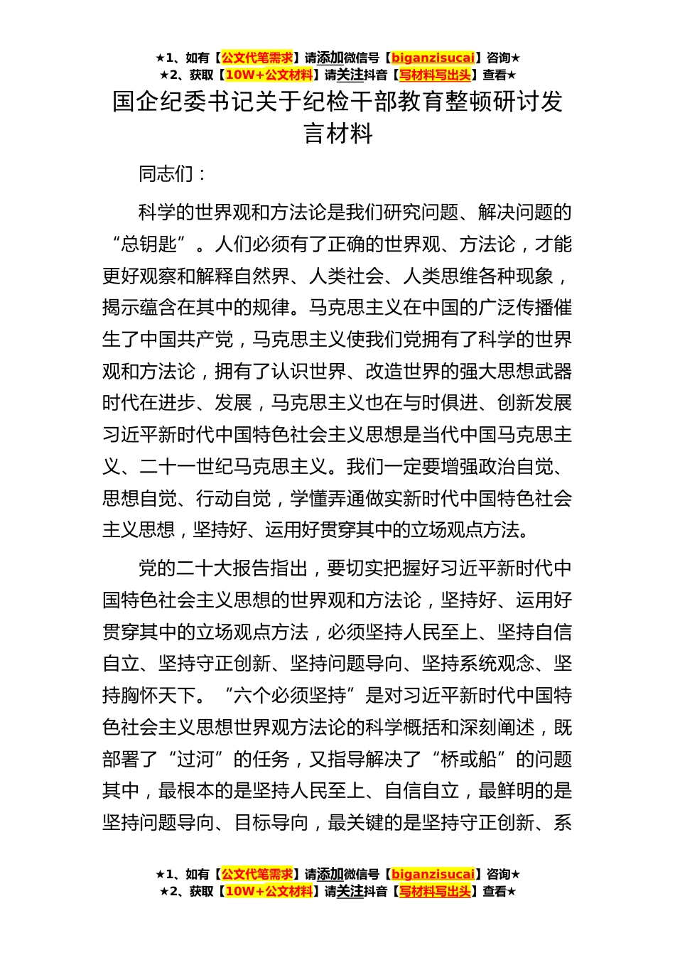 ★1、如有【公文代笔需求】请添加微信号【biganzisucai】咨询★★2、获取【10W+公文材料】请关注抖音【写材料写出头】查看★★1、如有【公文代笔需求】请添加微信号【biganzisucai】咨询★★2、获取【10W+公文材料】请关注抖音【写材料写出头】查看★★1、如有【公文代笔需求】请添加微信号【biganzisucai】咨询★★2、获取【10W+公文材料】请关注抖音【写材料写出头】查看★国企纪委书记关于纪检干部教育整顿研讨发言材料同志们:科学的世界观和方法论是我们研究问题、解决问题的“总钥匙”。人们必须有了正确的世界观、方法论,才能更好观察和解释自然界、人类社会、人类思维各种现象,揭示蕴含在其中的规律。马克思主义在中国的广泛传播催生了中国共产党,马克思主义使我们党拥有了科学的世界观和方法论,拥有...