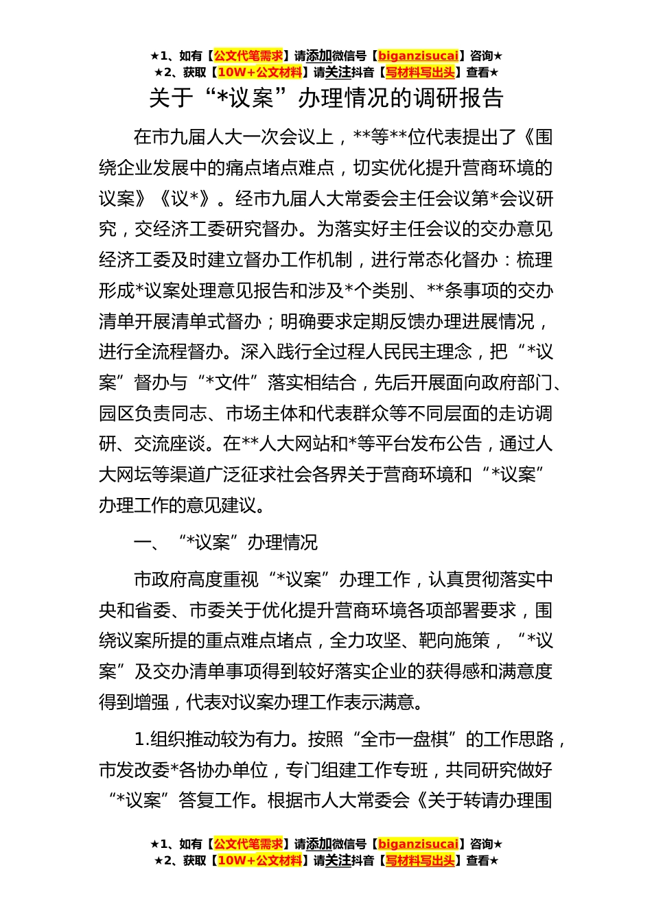 ★1、如有【公文代笔需求】请添加微信号【biganzisucai】咨询★★2、获取【10W+公文材料】请关注抖音【写材料写出头】查看★★1、如有【公文代笔需求】请添加微信号【biganzisucai】咨询★★2、获取【10W+公文材料】请关注抖音【写材料写出头】查看★★1、如有【公文代笔需求】请添加微信号【biganzisucai】咨询★★2、获取【10W+公文材料】请关注抖音【写材料写出头】查看★关于“*议案”办理情况的调研报告在市九届人大一次会议上,**等**位代表提出了《围绕企业发展中的痛点堵点难点,切实优化提升营商环境的议案》《议*》。经市九届人大常委会主任会议第*会议研究,交经济工委研究督办。为落实好主任会议的交办意见经济工委及时建立督办工作机制,进行常态化督办:梳理形成*议案处理意见报告和涉及*个类别、**...