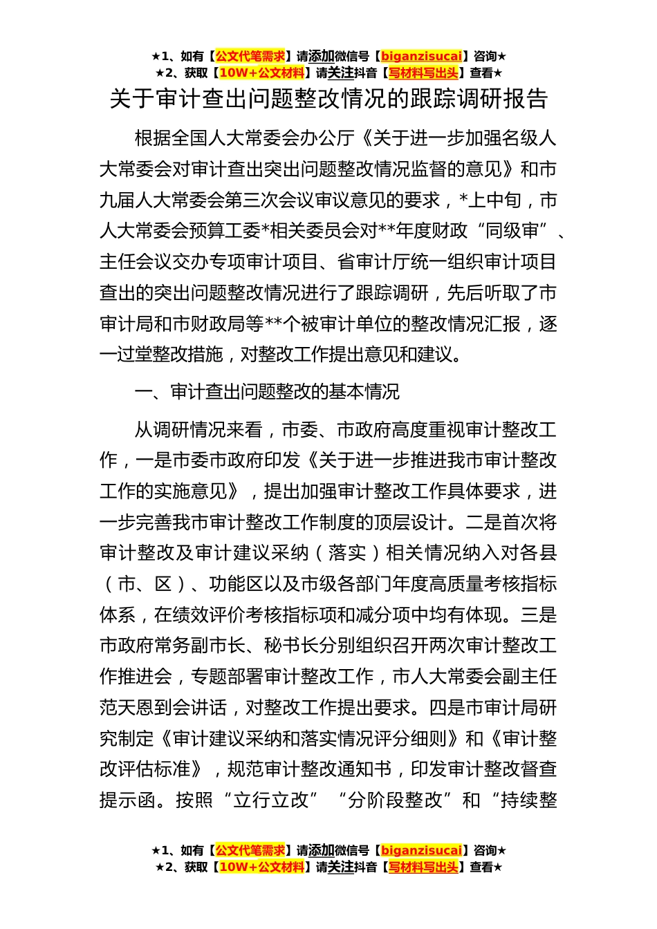 ★1、如有【公文代笔需求】请添加微信号【biganzisucai】咨询★★2、获取【10W+公文材料】请关注抖音【写材料写出头】查看★★1、如有【公文代笔需求】请添加微信号【biganzisucai】咨询★★2、获取【10W+公文材料】请关注抖音【写材料写出头】查看★★1、如有【公文代笔需求】请添加微信号【biganzisucai】咨询★★2、获取【10W+公文材料】请关注抖音【写材料写出头】查看★关于审计查出问题整改情况的跟踪调研报告根据全国人大常委会办公厅《关于进一步加强名级人大常委会对审计查出突出问题整改情况监督的意见》和市九届人大常委会第三次会议审议意见的要求,*上中旬,市人大常委会预算工委*相关委员会对**年度财政“同级审”、主任会议交办专项审计项目、省审计厅统一组织审计项目查出的突出问题整改情况进行...