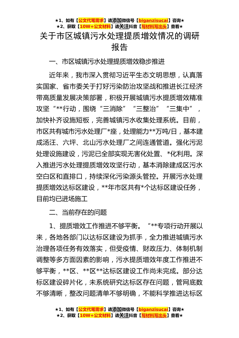 ★1、如有【公文代笔需求】请添加微信号【biganzisucai】咨询★★2、获取【10W+公文材料】请关注抖音【写材料写出头】查看★★1、如有【公文代笔需求】请添加微信号【biganzisucai】咨询★★2、获取【10W+公文材料】请关注抖音【写材料写出头】查看★★1、如有【公文代笔需求】请添加微信号【biganzisucai】咨询★★2、获取【10W+公文材料】请关注抖音【写材料写出头】查看★关于市区城镇污水处理提质增效情况的调研报告一、市区城镇污水处理提质增效稳步推进近年来,我市深入贯彻习近平生态文明思想,认真落实国家、省市委关于打好污染防治攻坚战和推进长江经济带高质量发展决策部署,积极开展城镇污水提质增效精准攻坚“**行动,围绕“三消除”“三整治”“三集中”,加快补齐设施短板,完善城镇污水收集处理系...