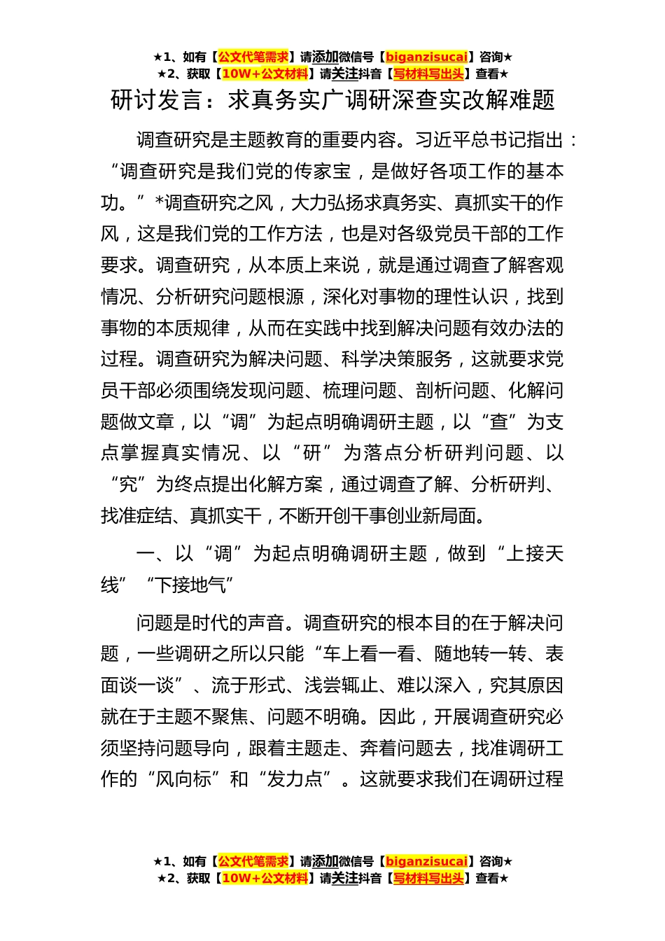★1、如有【公文代笔需求】请添加微信号【biganzisucai】咨询★★2、获取【10W+公文材料】请关注抖音【写材料写出头】查看★★1、如有【公文代笔需求】请添加微信号【biganzisucai】咨询★★2、获取【10W+公文材料】请关注抖音【写材料写出头】查看★★1、如有【公文代笔需求】请添加微信号【biganzisucai】咨询★★2、获取【10W+公文材料】请关注抖音【写材料写出头】查看★研讨发言:求真务实广调研深查实改解难题调查研究是主题教育的重要内容。习近平总书记指出:“调查研究是我们党的传家宝,是做好各项工作的基本功。”*调查研究之风,大力弘扬求真务实、真抓实干的作风,这是我们党的工作方法,也是对各级党员干部的工作要求。调查研究,从本质上来说,就是通过调查了解客观情况、分析研究问题根源,深化对...