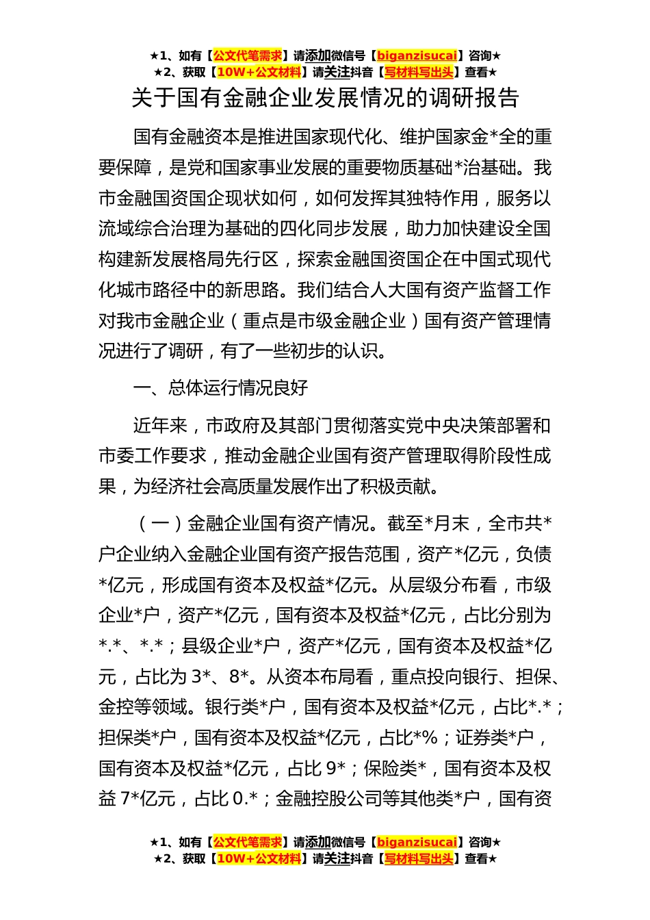★1、如有【公文代笔需求】请添加微信号【biganzisucai】咨询★★2、获取【10W+公文材料】请关注抖音【写材料写出头】查看★★1、如有【公文代笔需求】请添加微信号【biganzisucai】咨询★★2、获取【10W+公文材料】请关注抖音【写材料写出头】查看★★1、如有【公文代笔需求】请添加微信号【biganzisucai】咨询★★2、获取【10W+公文材料】请关注抖音【写材料写出头】查看★关于国有金融企业发展情况的调研报告国有金融资本是推进国家现代化、维护国家金*全的重要保障,是党和国家事业发展的重要物质基础*治基础。我市金融国资国企现状如何,如何发挥其独特作用,服务以流域综合治理为基础的四化同步发展,助力加快建设全国构建新发展格局先行区,探索金融国资国企在中国式现代化城市路径中的新思路。我们结合人...