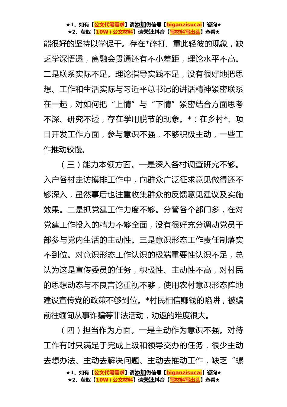 ★1、如有【公文代笔需求】请添加微信号【biganzisucai】咨询★★2、获取【10W+公文材料】请关注抖音【写材料写出头】查看★党委副书记主题教育民主生活会个人对照检查材料(**字)围绕“学思想、强党性、重实践、建新功”总要求,本人认真学习习近平新时代中国特色社会主义思想和党的二十大精神,同时广泛听取各方意见,重点对照*方面内容,进行深入查找存在的问题,深刻对照原因进行分析,明确今后的努力方向和整改措施。现将有关对照检查情况汇报如下:一、存在的主要问题(一)理论学习方面。一是政治敏锐性不足。对一些政治敏感性,特别是对对一些新观点、新论断理解不够深透,对“四个自信”理解掌握的深度和广度还不够全面,在系统钻研蕴含其中的深刻内涵和精神实质做得还不够深入。二是大局意识不足。在完...