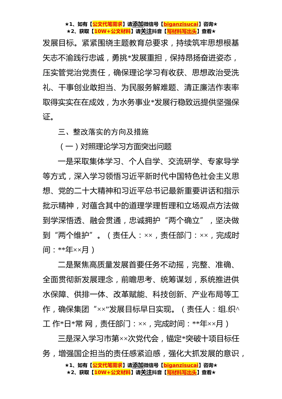 ★1、如有【公文代笔需求】请添加微信号【biganzisucai】咨询★★2、获取【10W+公文材料】请关注抖音【写材料写出头】查看★按照市委工作部署要求,坚持把严的标准、严的措施贯穿始终,切实抓好学习贯彻习近平新时代中国特色社会主义思想主题教育专题民主生活会整改落实工作,确保整改不漏项、不打折、不落空,真正把民主生活会的成果转化为加强党委班子建设、推动集团高质量发展的实际成效根据会议提出的整改方向和措施,结合会前领导班子征集的意见,特制定本整改落实方案。一、总体要求深入学习贯彻习近平新时代中国特色社会主义思想,聚焦学思想、强党性、重实践、建新功总要求,对照凝心铸魂筑牢根本、锤炼品格强化忠诚、实干担当促进发展、践行宗旨为民造福、廉洁奉公树立新风具体目标,深入学习领悟以学铸...