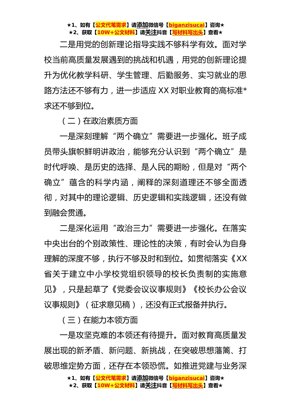 ★1、如有【公文代笔需求】请添加微信号【biganzisucai】咨询★★2、获取【10W+公文材料】请关注抖音【写材料写出头】查看★学校**年主题教育专题民主生活会领导班子对照检查材料(**字)典型案例剖析根据《关于在学习贯彻习近平新时代中国特色社会主义思想主题教育中开好专题民主生活会的通知》精神,学校党委准确把握本次专题民主生活会主题,周密部署,精心制定《中共XX学校委员会关于在学习贯彻习近平新时代中国特色社会主义思想主题教育中开好专题民主生活会的工作方案》,明确各环节工作步骤。会前,领导班子对标省委,围绕习近平总书记关于党的建设的重要思思、关于严肃党内政治生活的重要讲话等内容深入开展集中学习,班子成员之间开展谈心谈话,开诚布公谈不足。领导班子重点对照理论学习、政治素质、能...