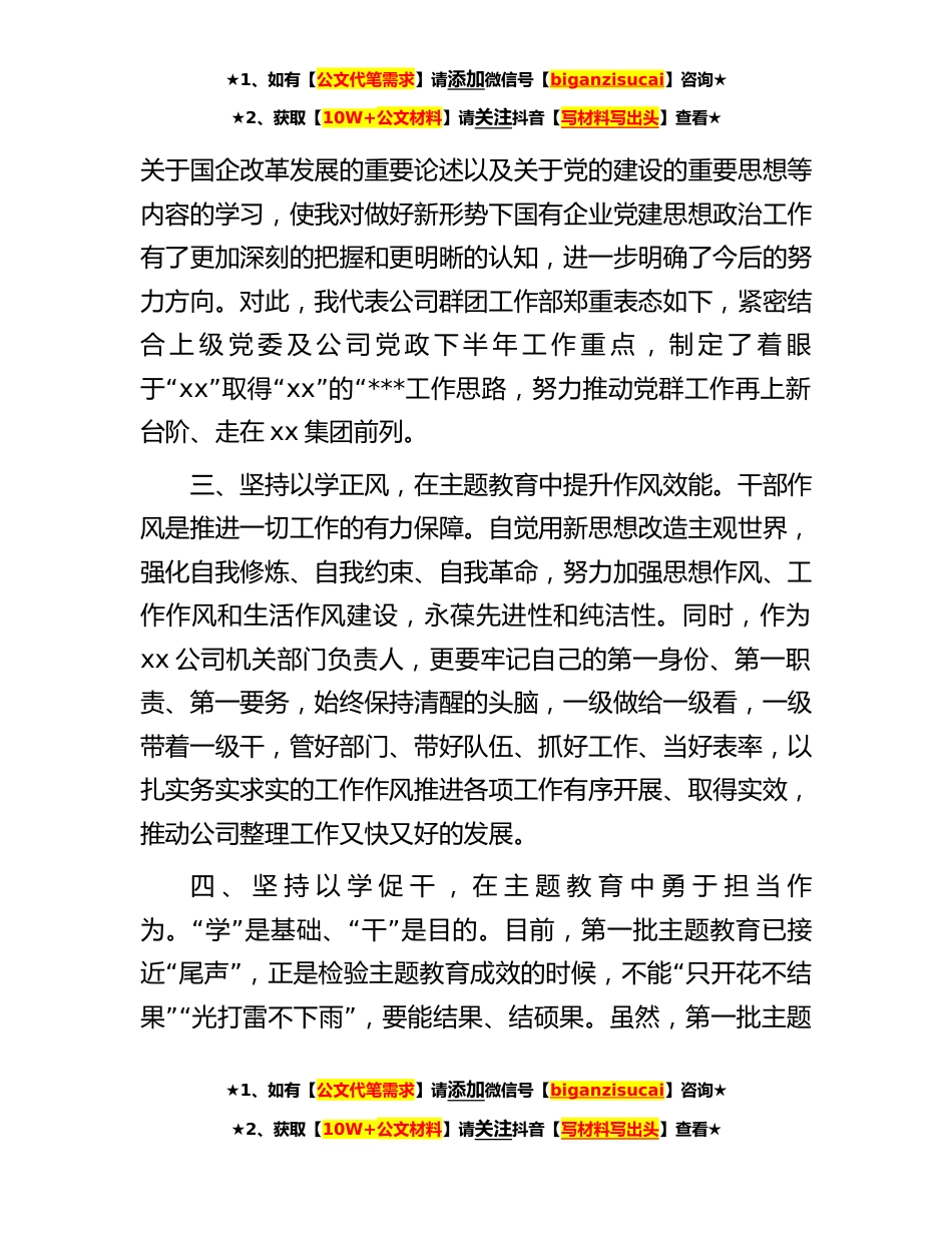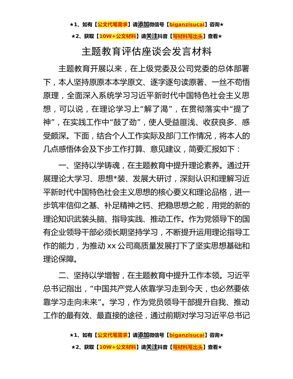 ★1、如有【公文代笔需求】请添加微信号【biganzisucai】咨询★★2、获取【10W+公文材料】请关注抖音【写材料写出头】查看★主题教育评估座谈会发言材料主题教育开展以来,在上级党委及公司党委的总体部署下,本人坚持原原本本学原文、逐字逐句读原著、一丝不苟悟原理,全面深入系统学习习近平新时代中国特色社会主义思“”“想,可以说,在理论学习上解了渴,在贯彻落实中提了”“”神,在实践工作中鼓了劲,使人受益匪浅、收获良多、感受颇深。下面,结合个人工作实际及部门工作情况,将本人的几点感悟体会及下步工作打算、意见建议,简要汇报如下:一、坚持以学铸魂,在主题教育中提升理论素养。通过开展理论大学习、思想*装、发展大研讨,深刻认识和理解习近平新时代中国特色社会主义思想的核心要义和理论品格...