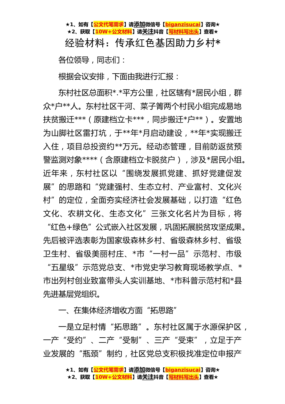 ★1、如有【公文代笔需求】请添加微信号【biganzisucai】咨询★★2、获取【10W+公文材料】请关注抖音【写材料写出头】查看★★1、如有【公文代笔需求】请添加微信号【biganzisucai】咨询★★2、获取【10W+公文材料】请关注抖音【写材料写出头】查看★★1、如有【公文代笔需求】请添加微信号【biganzisucai】咨询★★2、获取【10W+公文材料】请关注抖音【写材料写出头】查看★经验材料:传承红色基因助力乡村*各位领导,同志们:根据会议安排,下面由我进行汇报:东村社区总面积*.*平方公里,社区辖有*居民小组,群众*户**人。东村社区干河、菜子箐两个村民小组完成易地扶贫搬迁***(原建档立卡***,同步搬迁*户**)。安置地为山脚社区雷打坑,于**年*月启动建设,**年*实现搬迁入住,项目总投资约**万元。经动态管...