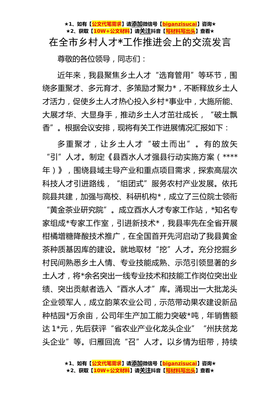 ★1、如有【公文代笔需求】请添加微信号【biganzisucai】咨询★★2、获取【10W+公文材料】请关注抖音【写材料写出头】查看★★1、如有【公文代笔需求】请添加微信号【biganzisucai】咨询★★2、获取【10W+公文材料】请关注抖音【写材料写出头】查看★★1、如有【公文代笔需求】请添加微信号【biganzisucai】咨询★★2、获取【10W+公文材料】请关注抖音【写材料写出头】查看★在全市乡村人才*工作推进会上的交流发言尊敬的各位领导,同志们:近年来,我县聚焦乡土人才“选育管用”等环节,围绕多重聚才、多元育才、多策励才聚力*,不断释放乡土人才活力,促使乡土人才热心投入乡村*事业中,大施所能、大展才华、大显身手,推动乡土人才茁壮成长,“破土飘香”。根据会议安排,现将有关工作进展情况汇报如下:多重聚...