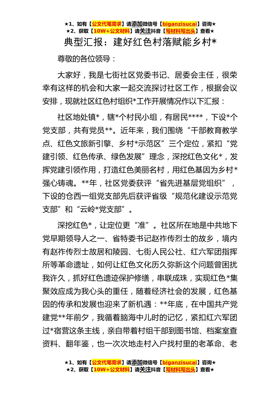 ★1、如有【公文代笔需求】请添加微信号【biganzisucai】咨询★★2、获取【10W+公文材料】请关注抖音【写材料写出头】查看★★1、如有【公文代笔需求】请添加微信号【biganzisucai】咨询★★2、获取【10W+公文材料】请关注抖音【写材料写出头】查看★★1、如有【公文代笔需求】请添加微信号【biganzisucai】咨询★★2、获取【10W+公文材料】请关注抖音【写材料写出头】查看★典型汇报:建好红色村落赋能乡村*尊敬的各位领导:大家好,我是七街社区党委书记、居委会主任,很荣幸有这样的机会和大家一起交流探讨社区工作,根据会议安排,现就社区红色村组织*工作开展情况作以下汇报:社区地处镇*,辖*个村民小组,有居民****,下设*个党支部,共有党员**。近年来,我们围绕“干部教育教学点、红色文旅新引擎、乡村*...