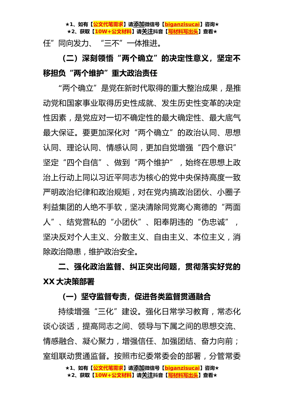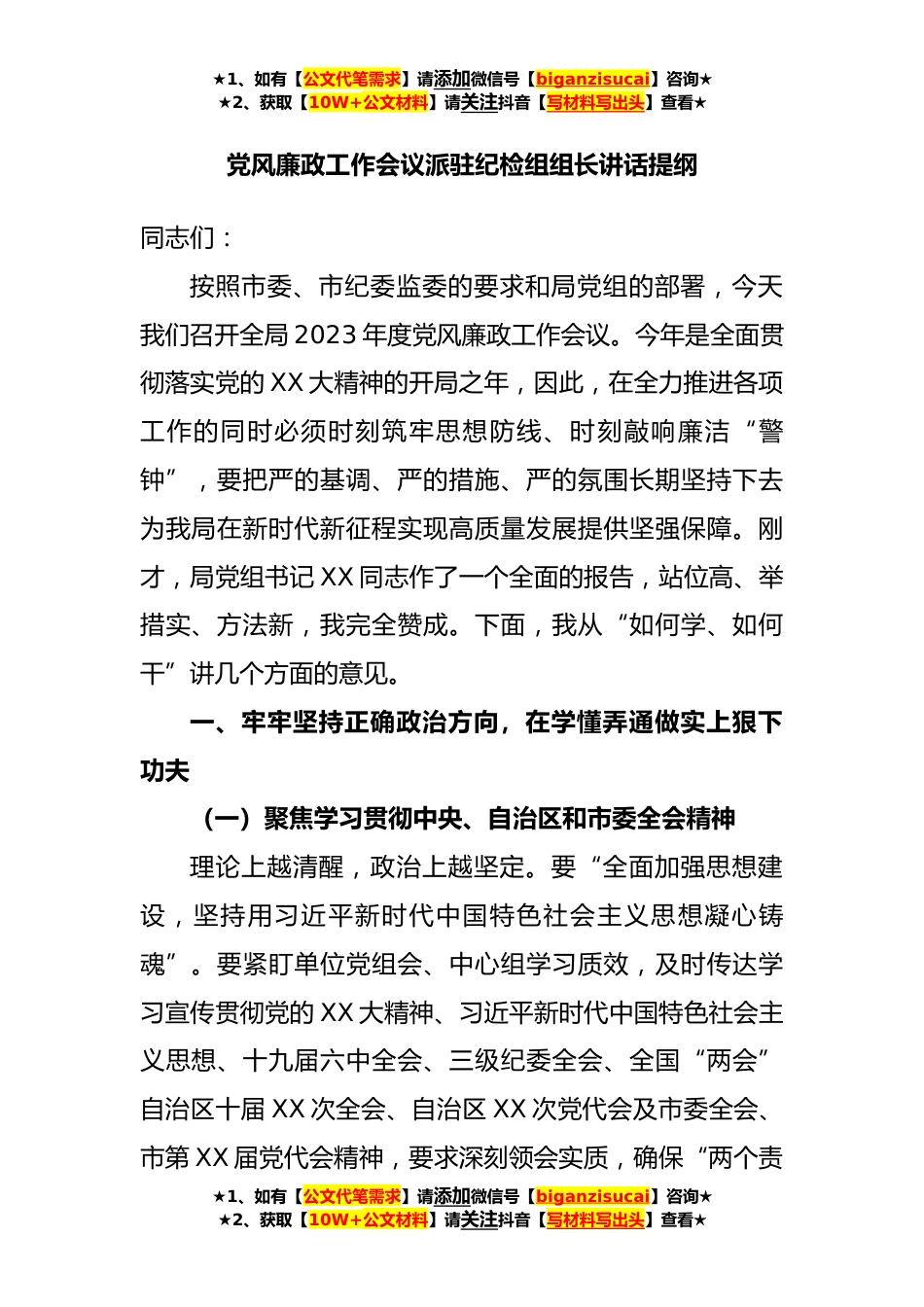 ★1、如有【公文代笔需求】请添加微信号【biganzisucai】咨询★★2、获取【10W+公文材料】请关注抖音【写材料写出头】查看★党风廉政工作会议派驻纪检组组长讲话提纲同志们:按照市委、市纪委监委的要求和局党组的部署,今天我们召开全局2023年度党风廉政工作会议。今年是全面贯彻落实党的XX大精神的开局之年,因此,在全力推进各项工作的同时必须时刻筑牢思想防线、时刻敲响廉洁“警钟”,要把严的基调、严的措施、严的氛围长期坚持下去为我局在新时代新征程实现高质量发展提供坚强保障。刚才,局党组书记XX同志作了一个全面的报告,站位高、举措实、方法新,我完全赞成。下面,我从“如何学、如何干”讲几个方面的意见。一、牢牢坚持正确政治方向,在学懂弄通做实上狠下功夫(一)聚焦学习贯彻中央、自治区和市...