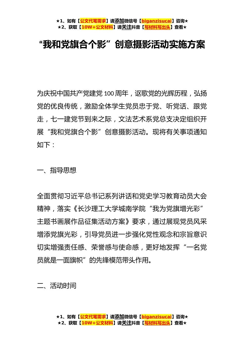★1、如有【公文代笔需求】请添加微信号【biganzisucai】咨询★★2、获取【10W+公文材料】请关注抖音【写材料写出头】查看★“我和党旗合个影”创意摄影活动实施方案为庆祝中国共产党建党100周年,讴歌党的光辉历程,弘扬党的优良传统,激励全体学生党员忠于党、听党话、跟党走,七一建党节到来之际,文法艺术系党总支决定组织开展“我和党旗合个影”创意摄影活动。现将有关事项通知如下:一、指导思想全面贯彻习近平总书记系列讲话和党史学习教育动员大会精神,落实《长沙理工大学城南学院“我为党旗增光彩”主题书画展作品征集活动方案》要求,通过展现党员风采增添党旗光彩,引导党员进一步强化党性观念和宗旨意识切实增强责任感、荣誉感与使命感,更好地发挥“一名党员就是一面旗帜”的先锋模范带头作用。二、...