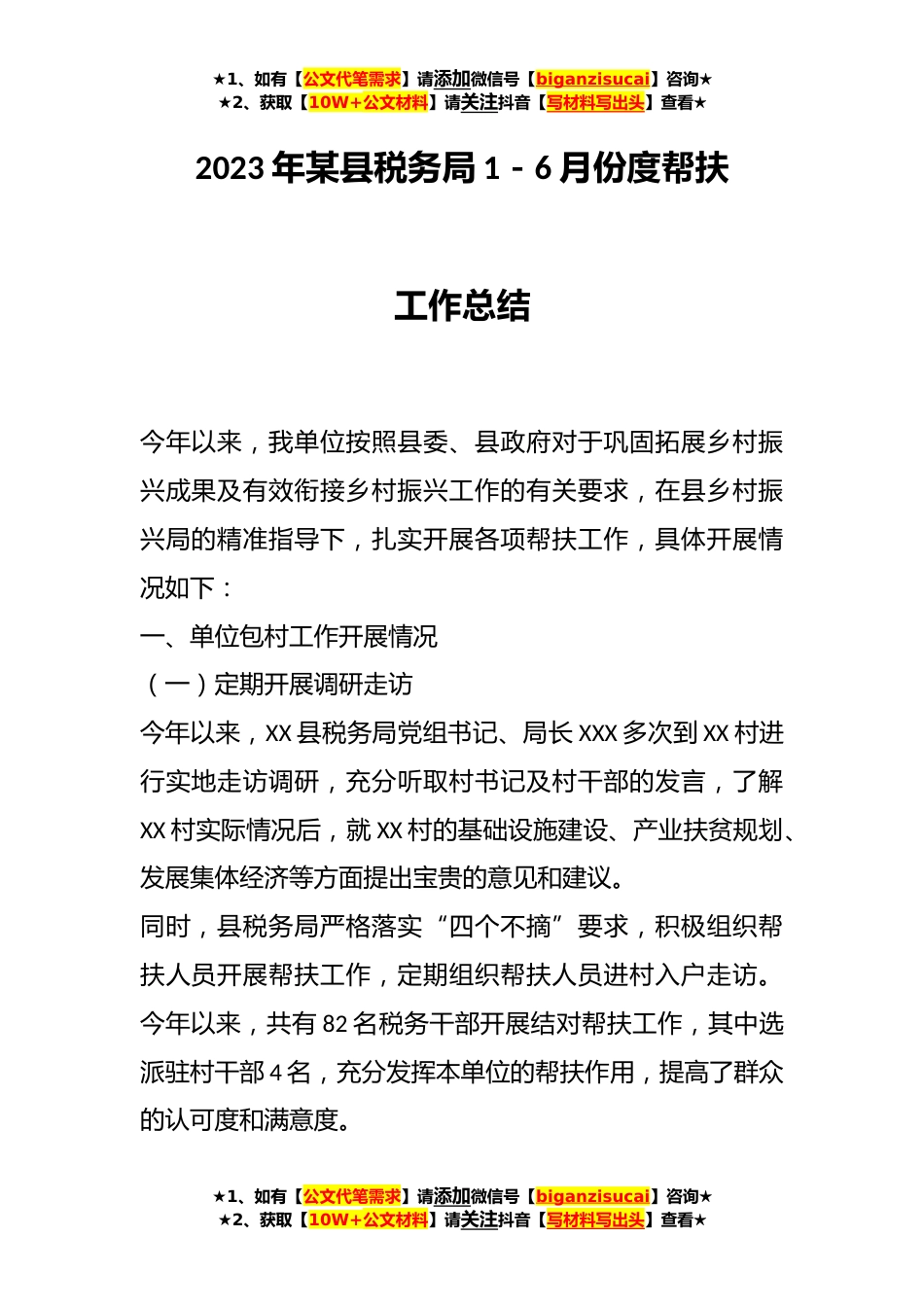 ★1、如有【公文代笔需求】请添加微信号【biganzisucai】咨询★★2、获取【10W+公文材料】请关注抖音【写材料写出头】查看★2023年某县税务局1-6月份度帮扶工作总结今年以来,我单位按照县委、县政府对于巩固拓展乡村振兴成果及有效衔接乡村振兴工作的有关要求,在县乡村振兴局的精准指导下,扎实开展各项帮扶工作,具体开展情况如下:一、单位包村工作开展情况(一)定期开展调研走访今年以来,XX县税务局党组书记、局长XXX多次到XX村进行实地走访调研,充分听取村书记及村干部的发言,了解XX村实际情况后,就XX村的基础设施建设、产业扶贫规划、发展集体经济等方面提出宝贵的意见和建议。同时,县税务局严格落实“四个不摘”要求,积极组织帮扶人员开展帮扶工作,定期组织帮扶人员进村入户走访。今年以来,共有...